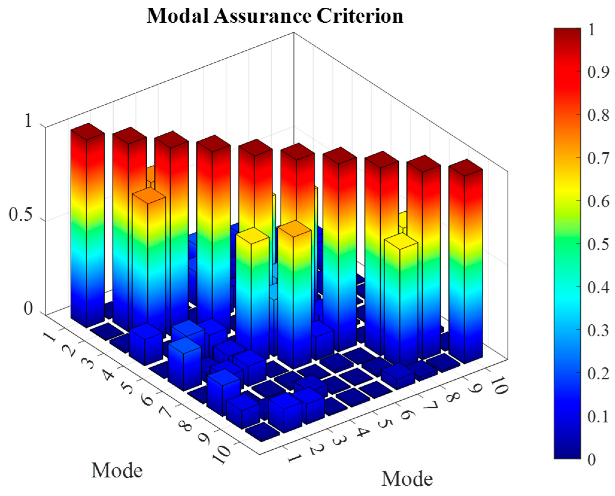 The Modal Assurance Criterion (MAC) calculated among all identified modes, denoted as AutoMAC, is reported in graphical form in the AutoMAC matrix of Figure 14. This index provides an indication of the decoupling between two modes at the time and how close their identified modes are to each other. For illustrative purposes, the ten global mode shapes identified are plotted in Figure 15.