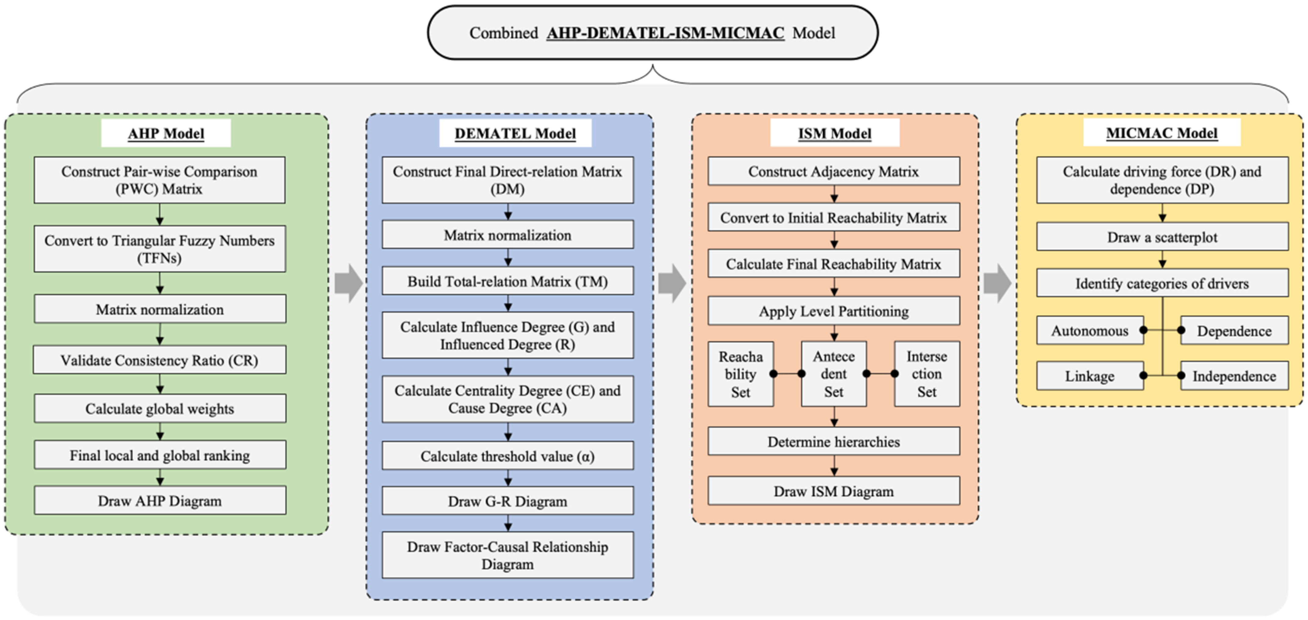 Figure 2). The four models, AHP, DEMATEL, ISM and MICMAC, are commonly used as Multiple Criteria Decision Making (MCDM) methods to evaluate the best decision options or summarize the analysis based on multiple criteria. The combination of these four methods can make the research process more complete, rational and scientific. The purpose of the AHP method is to establish the basic and comprehensive weights of each factor, and DEMATEL is used to analyze the relationship between various factors and construct a matrix. ISM is adopted to build a multi-layer recursive structure model to further analyze the hierarchical structure and overall influencing relationship among the influencing factors. MICMAC is used to identify the driving factors for the adoption of AI technologies, as well as to provide the basis for subsequent analysis and implementation strategies.