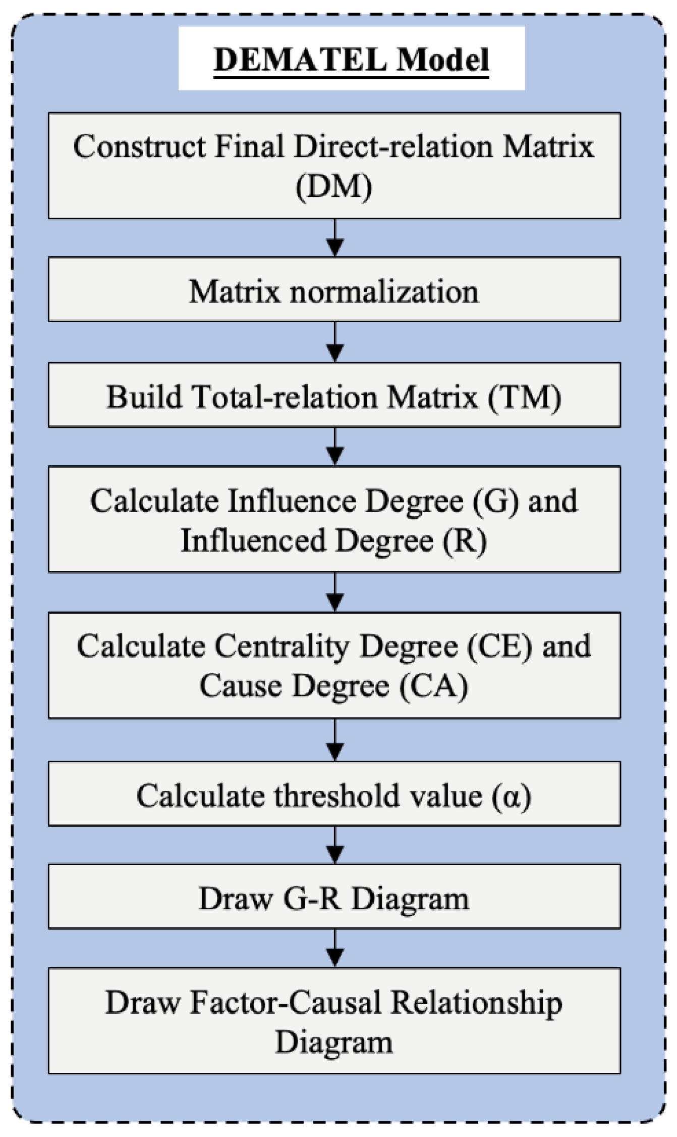 In this section, the Likert Scale and the Structural Self-Interaction Matrix (SSIM) method were selected for the design of the scales and questionnaires. The Likert Scale is a rating tool used to measure attitudes or opinions, consisting of a series of statements to which respondents indicate their level of agreement using numerical scales or shorthand codes. For the AHP and DEMATEL sections, scores from 1 to 5 correspond to: (1) Equal Importance (EQI), (2) Moderate Importance (MI), (3) Strong Importance (SI), (4) Very Strong Importance (VSI), and (5) Extreme Importance (EXI). In the DEMATEL section, differing from the “importance” comparisons in the AHP part, data are collected to analyze the “degree of influence” among the factors. Scores from 0 to 5 correspond to: (0) No Influence (NI), (1) Low Influence (LI), (2) Moderate Influence (MOI), (3) High Influence (HI), (4) Very High Influence (VHI), and (5) Extreme Influence (EI). The advantage of using the Likert Scale is that it allows respondents to maintain a neutral stance when completing the questionnaire, without immediately expressing opinions that could bias the analysis results. At the same time, it does not compel participants to take a position on a specific topic, allowing them to respond with varying degrees of agreement. For the ISM section, the SSIM-VAXO method of the Structural Self-Interaction Matrix is employed for questionnaire design. These responses are easily quantifiable, thereby enhancing the reliability of subsequent data analysis results.
