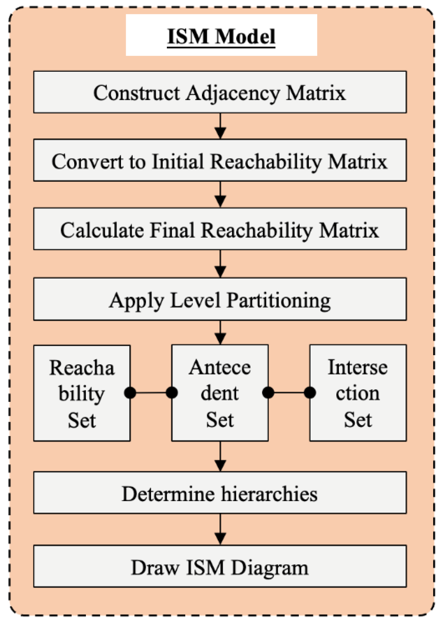 The hierarchy operation is performed to determine the level of each factor. In this step, the Reachability Set and the Antecedent Set are determined. The Reachability Set includes the factors it may influence and itself, while the Antecedent Set involves all factors that can reach the factor and itself.