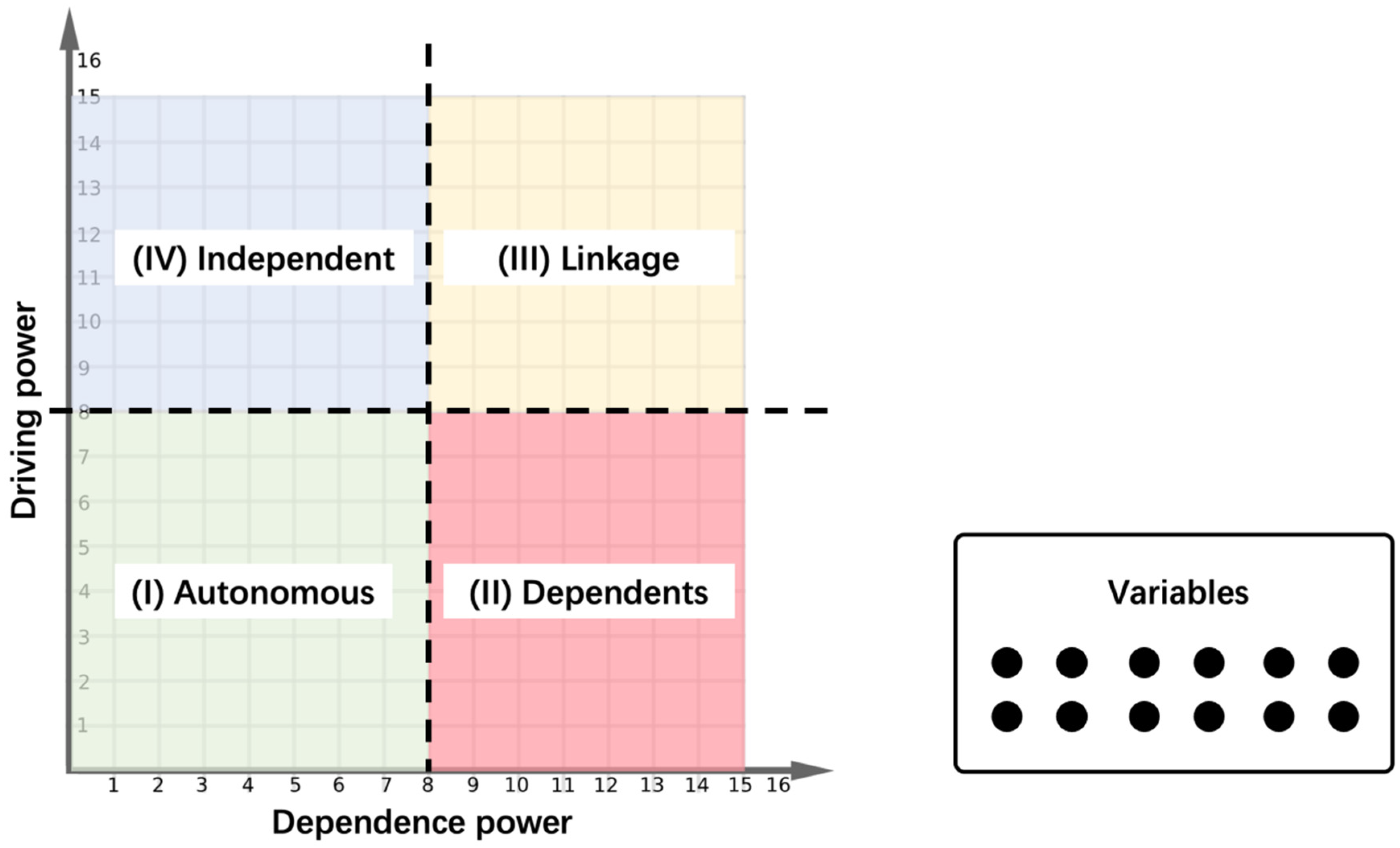 Figure 20 are determined based on the driving force and dependence values of the influencing factors. In this research, the boundary is set at the midpoint between the maximum driving force and the dependent force value. According to the calculation of the ISM step, the maximum driving force is 13, so the horizontal axis of the coordinate remains at the midpoint 6.5. Similarly, the maximum dependent force is 16, so the vertical axis of the coordinate remains at the midpoint 8.