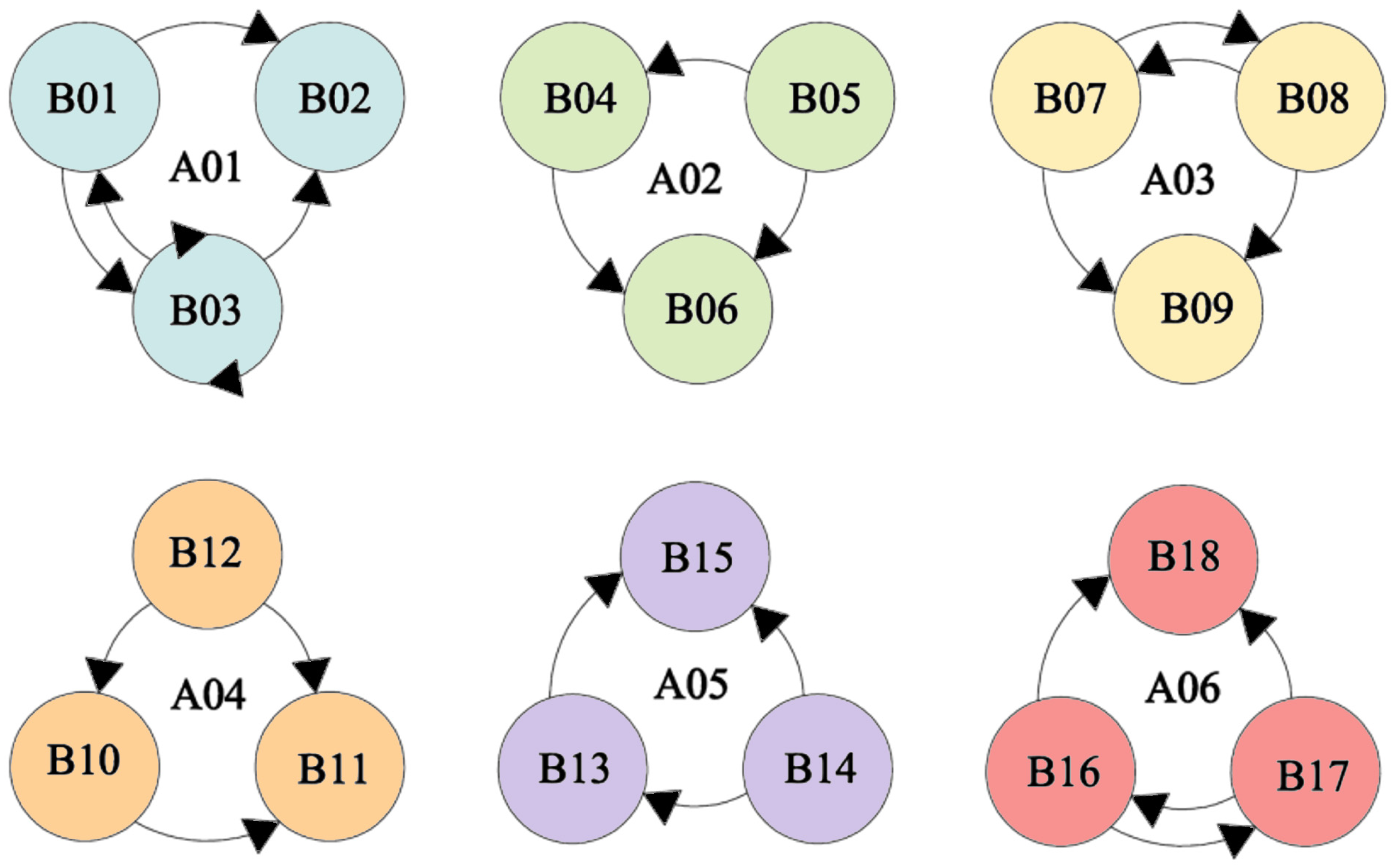 Table 6 shows that the influencing factors B01 and B03 belong to the cause group, implying that these two factors influence the factor B02. Similarly, B02 belongs to the result group, indicating that it is influenced by the other two factors B01 and B03.