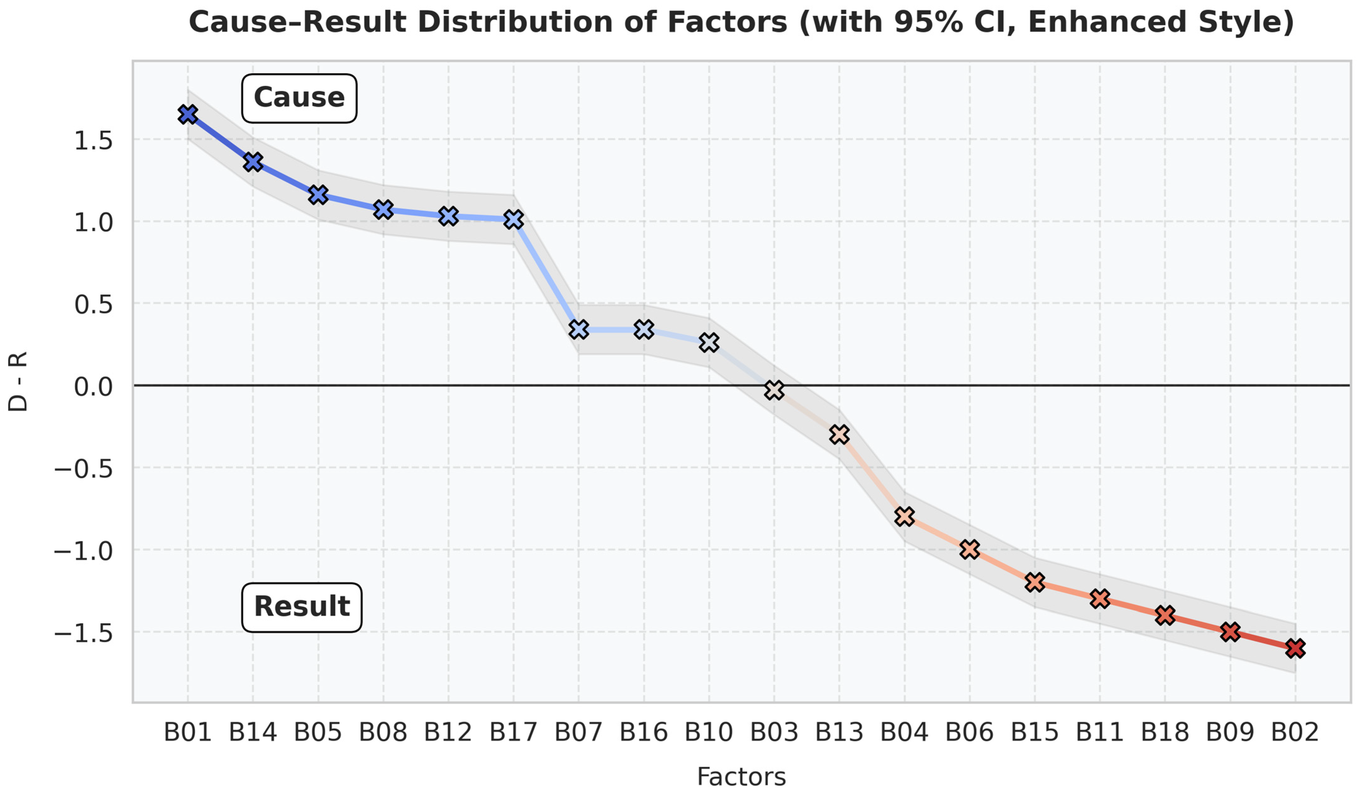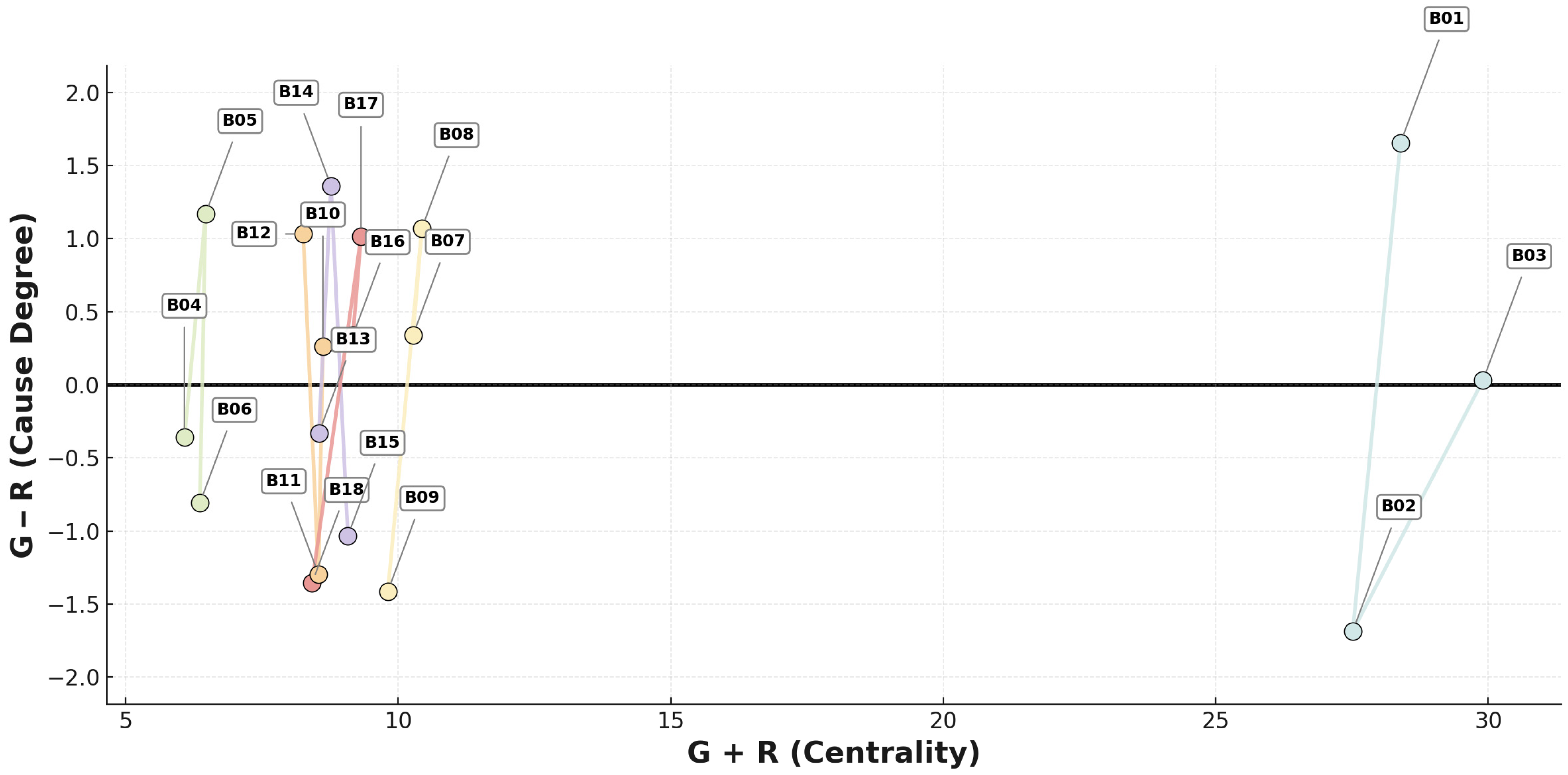 R value is the second lowest. On the other hand, project execution and process optimization (B12) are the most robust influencing factors in this group, with the highest Cause Degree (