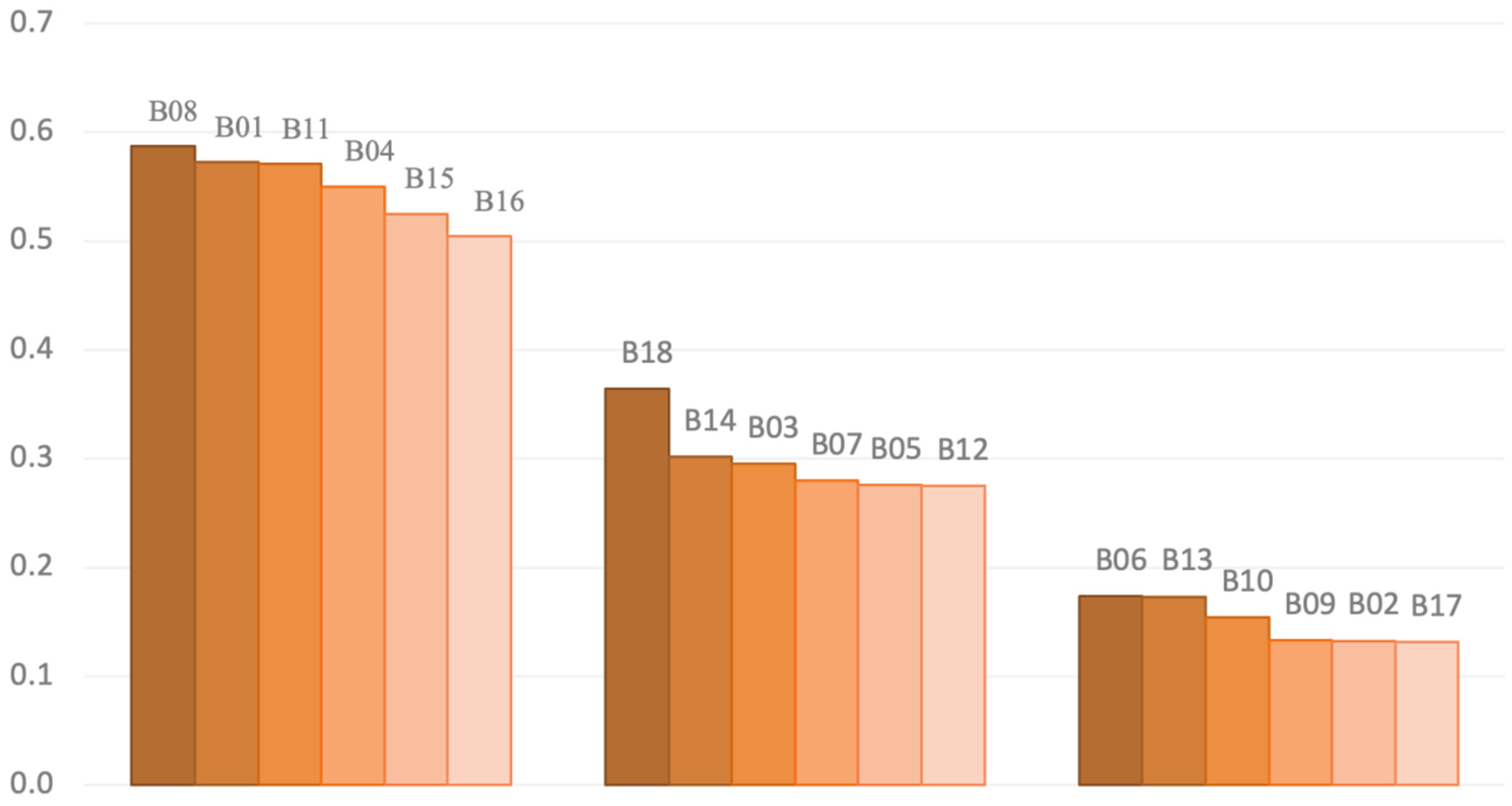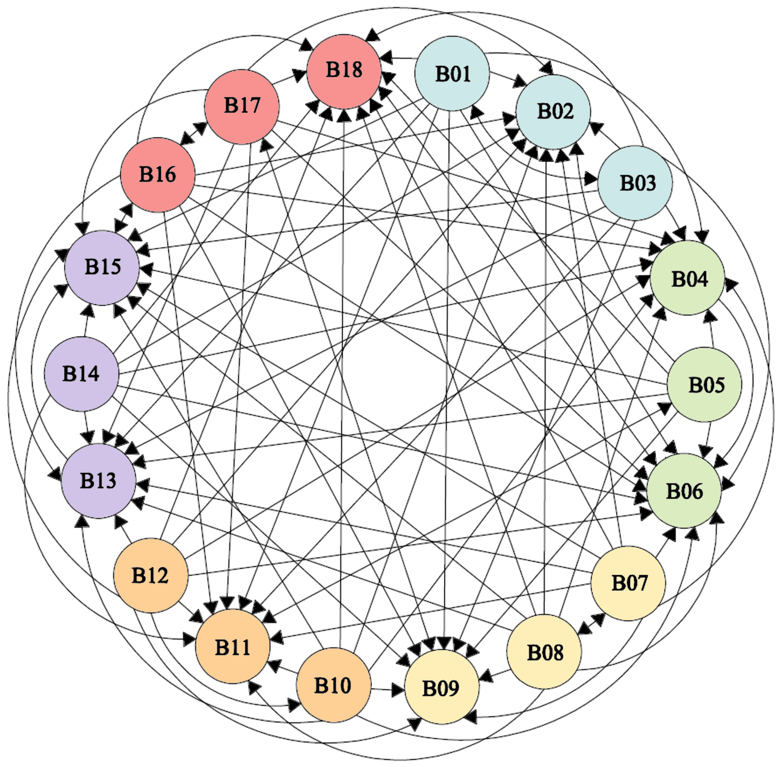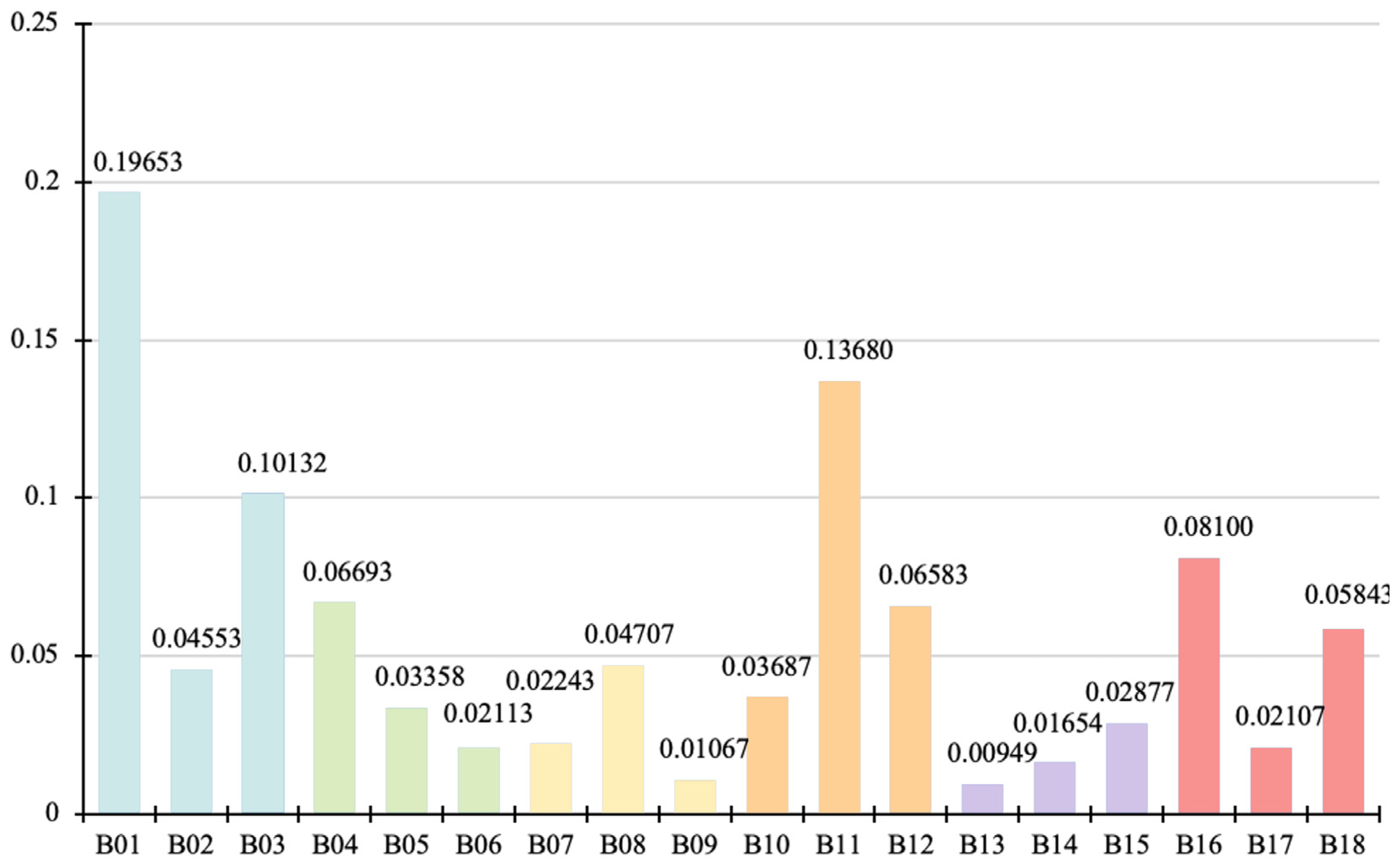 Figure 19. B02, B06, B13, and B18 are at the top of the hierarchy, and these four factors do not influence or promote other factors but are influenced by lower-hierarchy factors. In addition, the low-hierarchy factor B12 is the most critical factor among all factors that directly or indirectly influence other parameters above it.