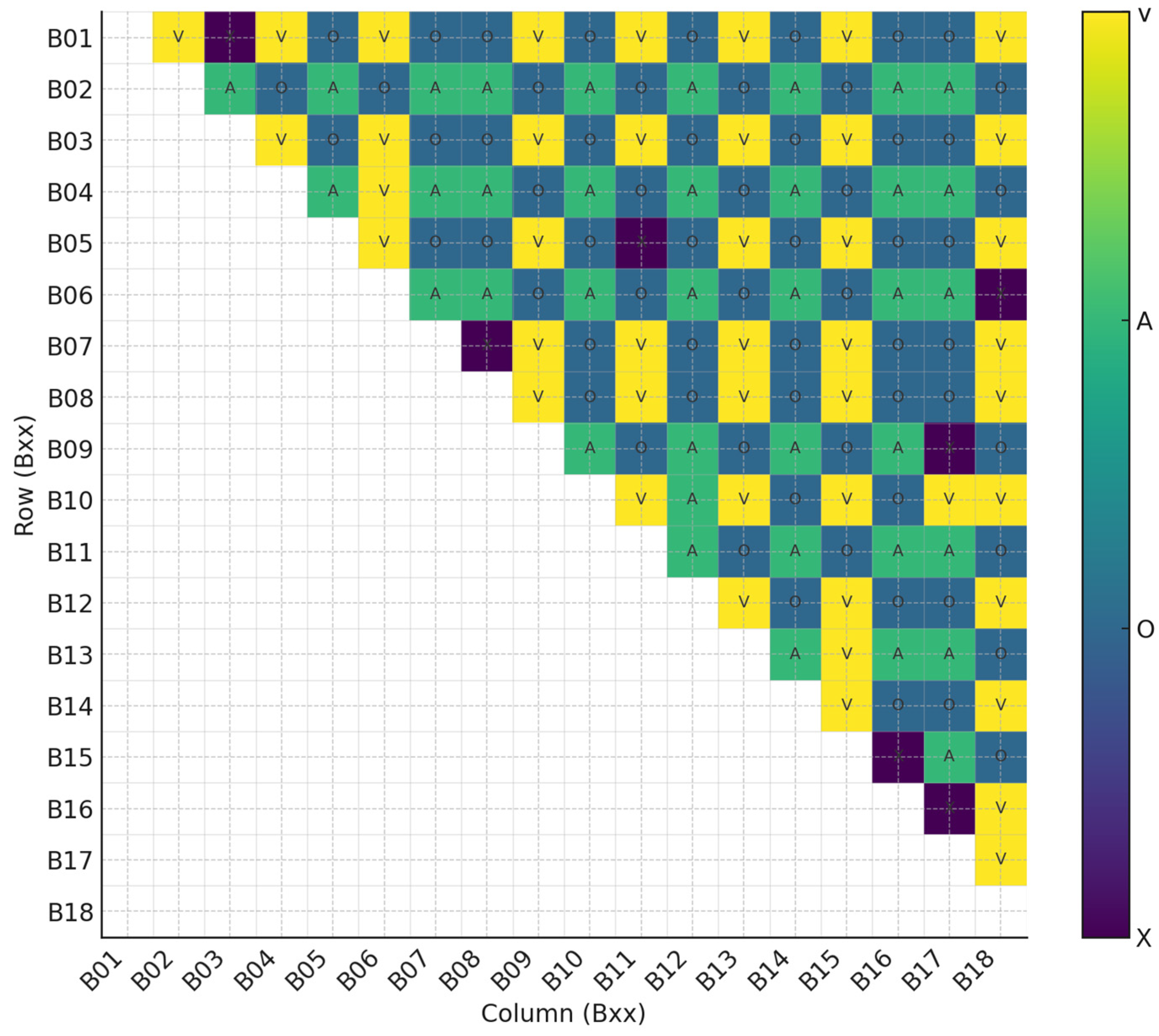 Table 7 explains the meaning of these letters in detail. On this basis, a Structural Self Interaction Matrix (SSIM) is developed to determine the types of interrelationships between the parameters. After the results of the SSIM questionnaire are obtained, the Plurality Rule is used to construct the final SSIM pairwise comparison matrix. The Plurality Rule is different from the Simple Majority Method. According to it, the occurring frequency of each element in the original SSIM pairwise comparison matrix is used as the statistical index, and the symbol with the highest number of occurrences is used as the corresponding element in the final SSIM pairwise comparison matrix. The basis for the SSIM procedure is the 18 secondary influencing factors that have been defined, and the relationship between them is shown in