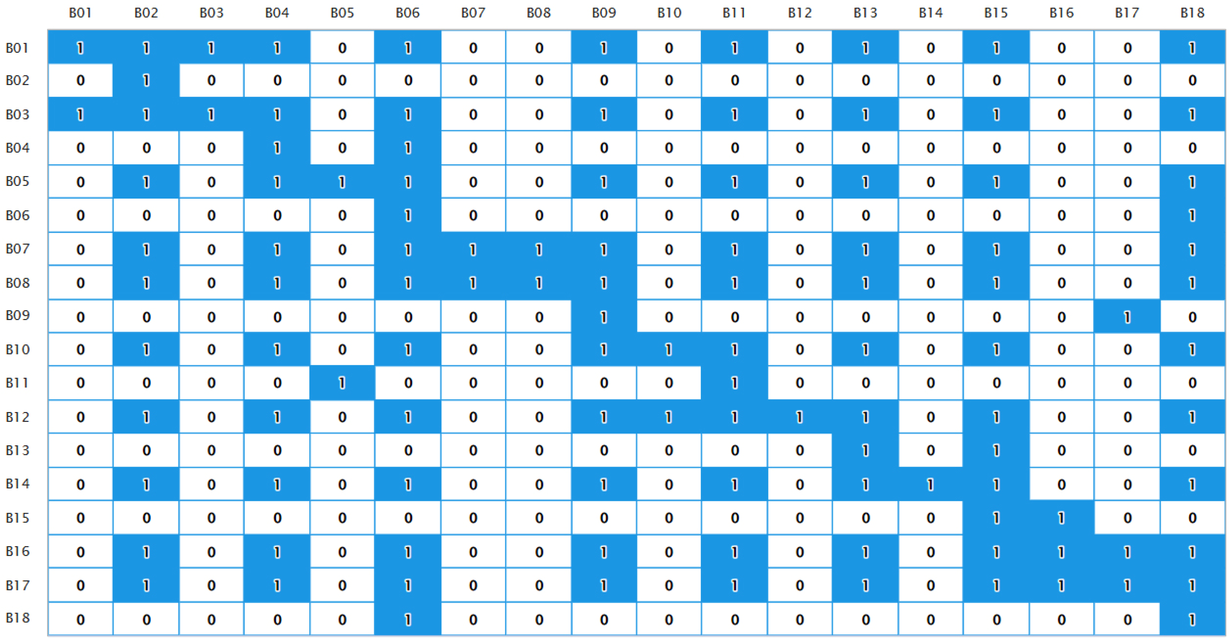 After the relationship of 18 secondary influencing factors of the ISM has been identified, the next step is to replace the letters with numerical values 1 and 0 to convert the SSIM into a binary matrix (