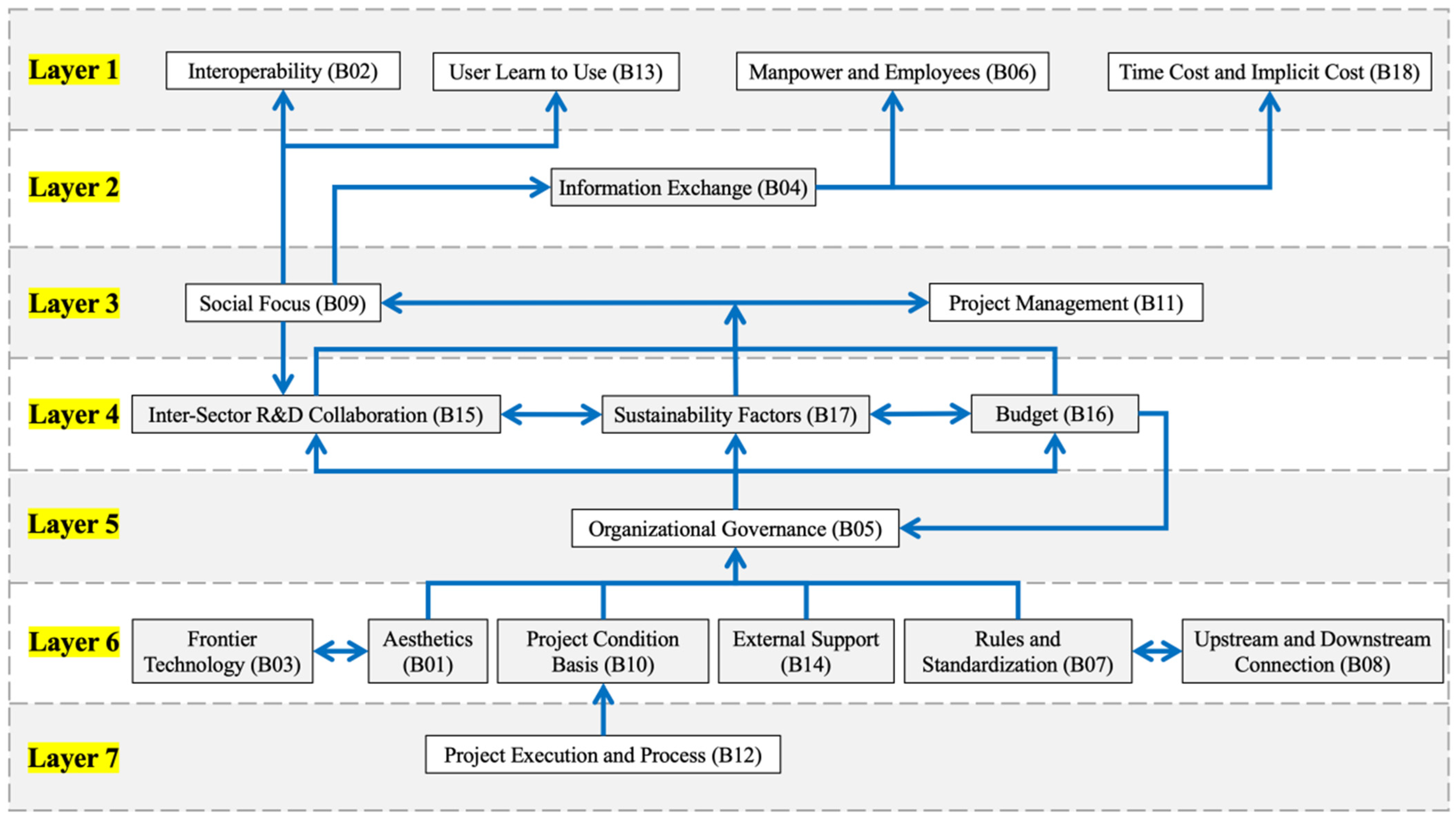 Figure 16. The results show that project execution and process optimization (B12) are at the bottom of the hierarchy, while interoperability (B02), manpower and employees (B06), user learning (B13), as well as time costs and hidden costs (B18) are at the top. The arrows in