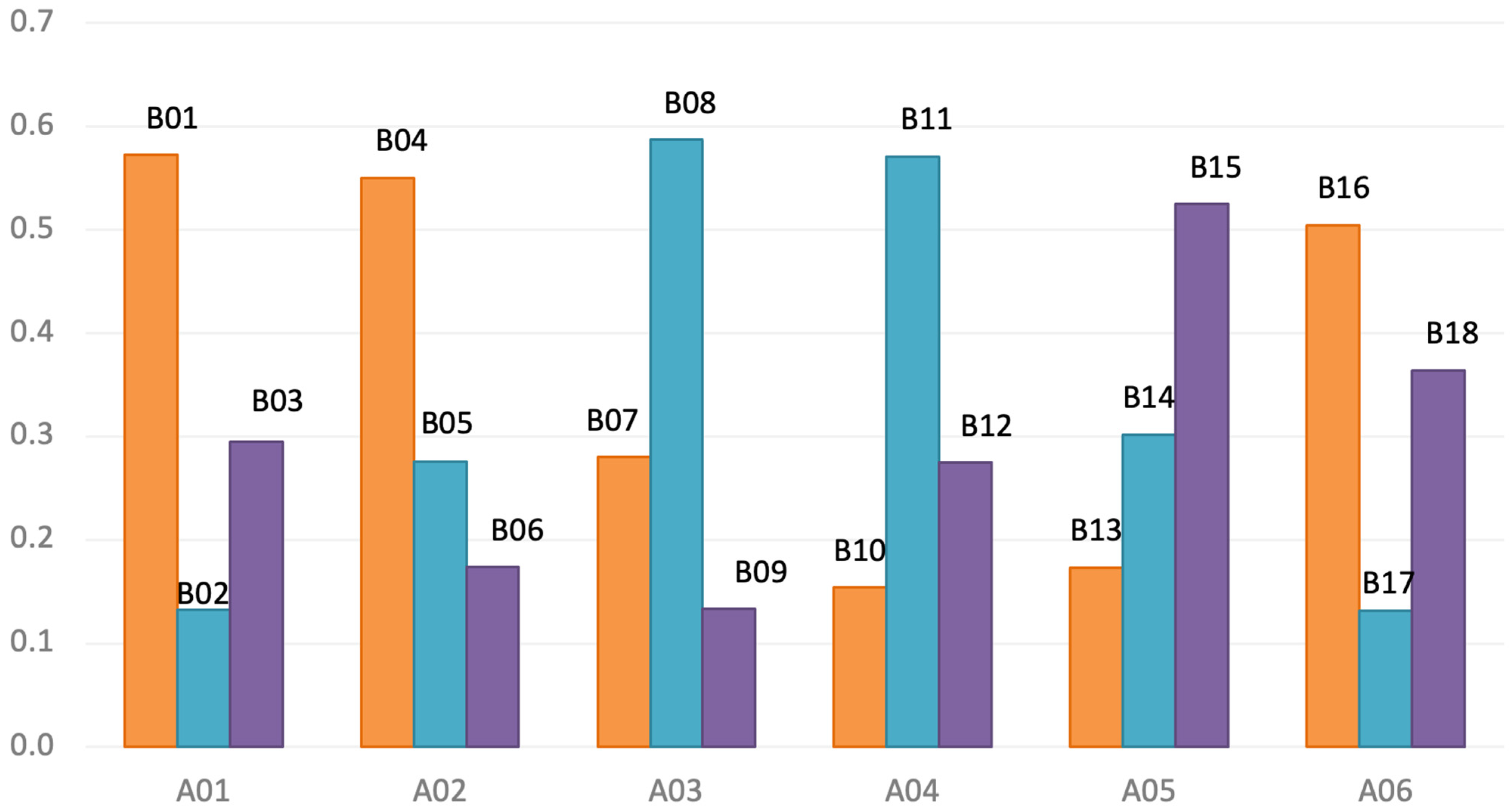 Table 5, aesthetics (B01) and user learning (B13) are, respectively, the most important indicator and least important indicator overall among the 18 secondary influencing factors. In addition, based on the local weights calculated by AHP in