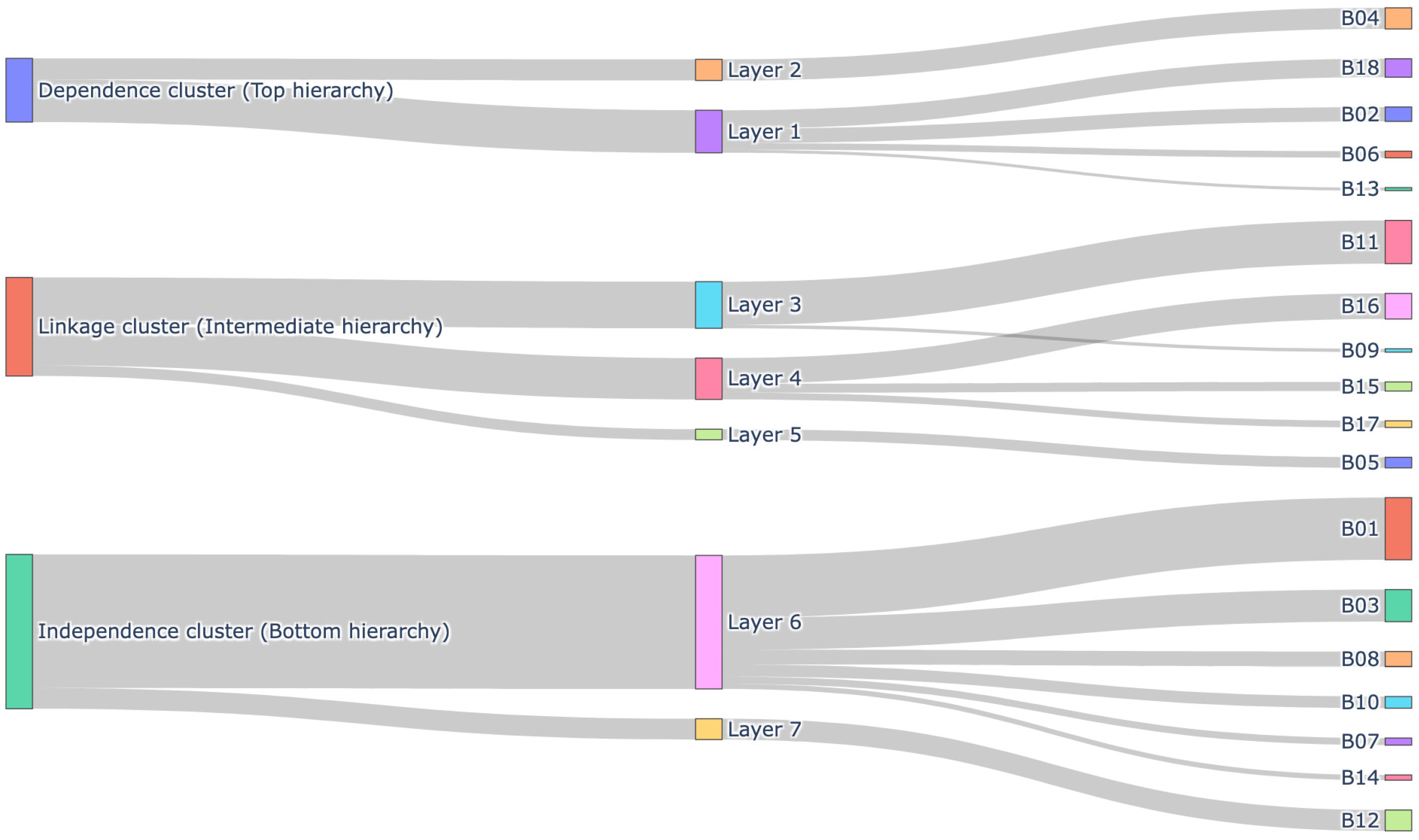 Figure 25 visualizes the flow of influence from MICMAC quadrants to ISM hierarchical layers and down to secondary factors (B01–B18). Link widths correspond to AHP global weights, providing an integrated view that connects classification (MICMAC), structure (ISM), and importance (AHP). The visualized relationship for the MICMAC-ISM distribution of secondary factors is shown in