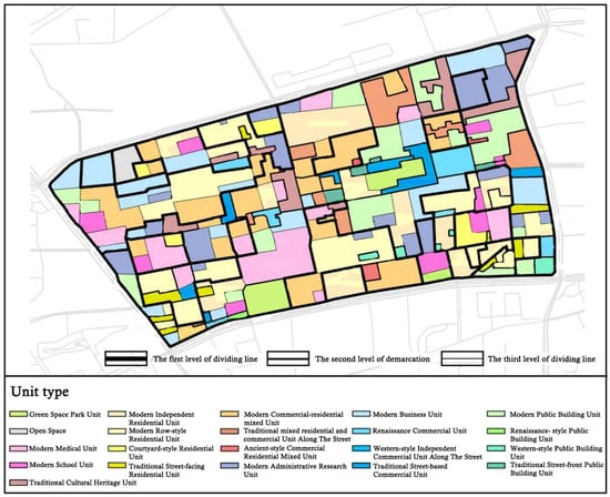 Based on Conzen’s tripartite urban morphological approach, we examine the Commercial District’s form through three aspects: spatial configuration (including street systems, plot divisions, and building footprints), architectural texture, and land use patterns [20]. By overlaying these morphological units, we delineate the district’s morphological regions. The zoning follows a three-tier hierarchy: Primary boundaries (4 regions) mark the most distinct morphological variations based on street patterns, plot configurations, and building footprint typologies. Secondary boundaries (11 units) consider architectural style and building height, including categories like modern detached units, traditional street-front units, and pseudo-historic independent units. Tertiary boundaries reflect the most dynamic factor-building function-yielding 21 total morphological units (Figure 3).