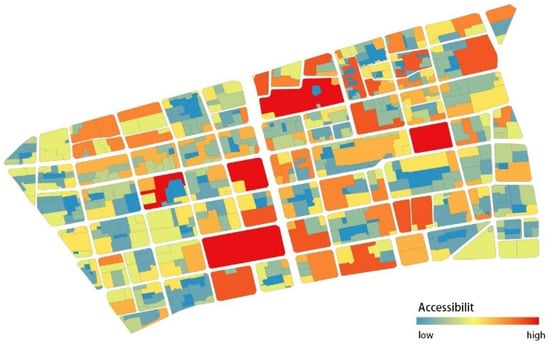 The resilience strength of street networks is characterized by connectivity, where highly connected streets in the Commercial District demonstrate greater resistance capacity [25] than less-connected tree-like street patterns.In urban historic district resilience assessment, connectivity shows an inverse relationship with resilience capacity. Using Depthmap, we analyzed five street network metrics (integration, choice, connectivity, synergy, and intelligibility), with values transformed through a distance decay model. GIS-based spatial interpolation then translated these street-level metrics into plot-level accessibility mapping across the district [26]. The resultant accessibility map displays a gradient from low (cool colors) to high (warm colors) accessibility (Figure 4). The accessibility values in Figure 4 are derived from a multi-step, quantitative spatial analysis based on Space Syntax theory, not merely proximity to wider streets. The process is as follows: