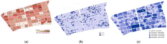 The land parcel resilience assessment employs three key indicators: modularity, diversity, and redundancy [27]. Modularity describes a system’s tendency to decompose into smaller units or aggregate into larger components [9]. Highly modular urban forms exhibit greater scalability and adaptive flexibility [28]. Our analysis reveals an inverse relationship between modularity and morphological resilience-higher modularity correlates with lower stress resistance. We evaluated parcel modularity using density, area, and shape index metrics [29]. The quantification follows these principles: A. Larger parcels indicate lower modularity and higher resilience; B. Higher shape index values suggest greater stability and long-term continuity. GIS reclassification of parcel density (Figure 5a), area (Figure 5b), and shape index (Figure 5c) generated the modularity assessment grids.