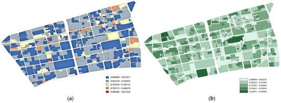 Diversity represents the most influential factor in urban fabric resilience [30]. We measure functional diversity through economic activity mixing, calculated using: Public facility density and facility mix ratio, derived from POI data collected via web-crawling technology. Higher values for both metrics indicate greater land use diversity. Both metrics show positive correlations with resilience-greater diversity enhances stress resistance. GIS-based weighted overlay of these metrics produced the land use diversity map (Figure 6a). The color gradient (blue to red) visualizes increasing facility concentration and functional mix, with warmer tones indicating higher diversity.
