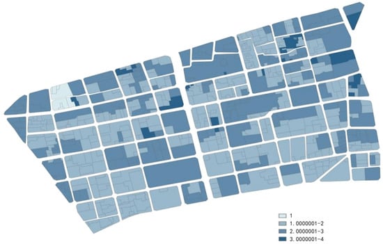 In the architectural dimension, robustness is used to measure the resilience of historic districts. Robustness refers to the ability of a building system to withstand internal and external shocks and stresses without significant loss or degradation of its primary functions. The structural integrity and material quality of buildings partly determine their stability when subjected to disturbances. Older buildings generally exhibit greater resistance to socio-environmental disruptions, reflecting higher stability. Here, building robustness is assessed using three indicators: structural type, age, and material quality. Buildings with higher-quality materials and longer construction histories demonstrate greater robustness and morphological resilience. Using GIS, we reclassified and weighted (2:5:3 ratio) spatial data on building structure, age, and quality to generate a robustness raster map of the concession area (Figure 7).