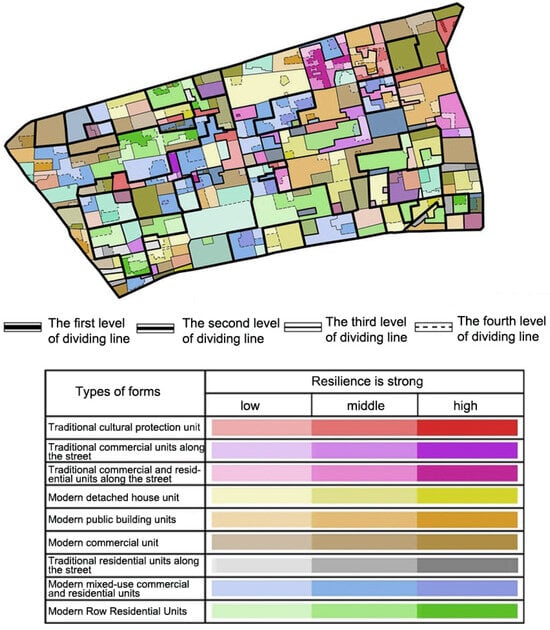Through GIS raster overlay analysis, we integrated the morphological zones with resilience assessment results to delineate morphological resilience zones (Fi). The resulting map introduces high, medium, and low resilience classifications as a fourth-tier categorization within the existing morphological zoning framework.