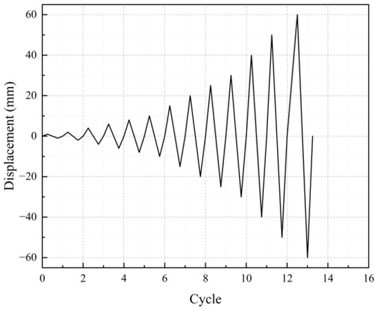 Figure 3 specifies the test loading protocol utilizing triangular waveform displacement control. The amplitude sequence was progressively applied as follows: 1 mm, 2 mm, 4 mm, 6 mm, 8 mm, 10 mm, 15 mm, 20 mm, 25 mm, 30 mm, 40 mm, 50 mm, and 60 mm.