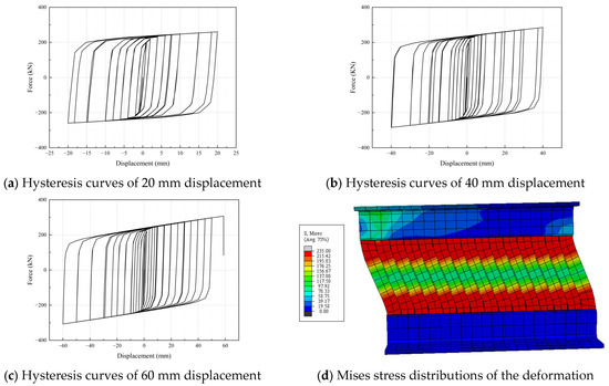 Figure 4 presents the finite element simulation results of the SSPSD. As shown in Figure 4a–c, the hysteresis curves of the SSPSD under different amplitudes are displayed. The damper exhibits stable hysteretic behavior characterized by continuous and full hysteresis loops without any pinching effect. The increase in displacement amplitude leads to a gradual expansion of the hysteresis loop area, demonstrating stable energy absorption and dissipation capacity under large deformations, which meets the core requirements for seismic resistance and vibration mitigation. The SSPSD exhibits high initial stiffness. During multiple cyclic loading tests, the slope of the curve in subsequent cycles shows a slight reduction compared to the first cycle, indicating minor stiffness degradation. However, the overall shape of the hysteresis loops remains stable without significant pinching or contraction. The loading and unloading curves in both positive and negative directions are nearly identical, demonstrating highly symmetric behavior. This confirms that the damper’s mechanical performance is remarkably consistent in both tension and compression states, with no noticeable bias. Overall, the damper demonstrates ideal stiffness characteristics and can play a critical role in protecting the primary structure from seismic damage. Figure 4d presents the finite element simulation stress contour of the SSPSD, illustrating pronounced shear deformation in the energy dissipation plates with significant stress concentration at their extremities. This confirms efficient structural performance mobilization within these critical components.