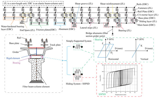 The seismic performance evaluation of high-speed railway track-bridge-damper systems (HSRTBDS) requires comprehensive integration of complex track-bridge coupling effects [33,34,35]. As depicted in Figure 5, this study investigates a five-span simply supported high-speed railway bridge with uniform pier heights (14 m) and CRTS II slab track, where each girder spans 32.6 m. The bridge incorporates 50 m transition sections at both ends and 90 m embankment segments. Utilizing design blueprints and technical specifications, spatial finite element models were developed in opensees: a baseline track-bridge system model and an enhanced HSRTBDS model incorporating SSPSDs [36].