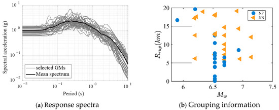 Appropriate ground motion records constitute a critical foundation for conducting nonlinear time-history analysis. To capture the inherent variability of seismic events, 40 records recommended by FEMA P-695 were selected from the Pacific Earthquake Engineering Research Center database (PEER). Statistical characteristics of magnitude, epicentral distance, and pulse properties are summarized in Table 3, encompassing both near-fault pulse-type and far-field non-pulse motions. Pulse-type ground motions necessitate focused attention on instantaneous failure mechanisms, while non-pulse motions require mitigation against cumulative damage. This dataset integrates strong velocity pulses and non-pulse events to address potential extreme scenarios. Using the mean spectral ratio amplitude scaling method, response spectra were matched to the Chinese seismic code target spectrum (Intensity 8, Site Class II). Post-scaling characteristics include a mean PGA of 0.47 g, with spectral property comparisons illustrated in Figure 7, ensuring input motion representativeness and analytical reliability. Uniform excitation was assumed across all structural supports, with ground motion directionality defined as transverse.