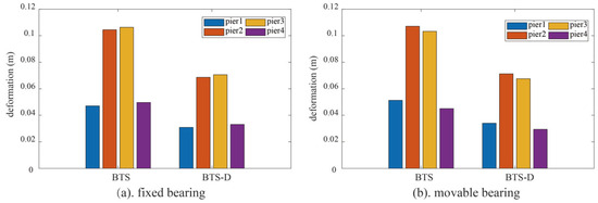 As critical supporting components, the seismic response of bearings directly impacts the safety of bridge superstructures. Figure 9a illustrates deformation in fixed bearings, where the incorporation of slitted steel plate dampers reduced peak deformation by an average of 33.90%. Table 4 presents comparative deformation data of fixed bearings after installation of SSPSDs. Maximum deformation of fixed bearings at Pier 2 position decreased from 104.48 mm to 68.66 mm—a 34.29% reduction. Figure 9b and Table 5 demonstrates even more significant improvement in movable bearings, with an average 34.12% response reduction and mean deformation of 50.56 mm, lower than the fixed bearings’ 50.81 mm. This performance differential may arise from synergistic energy dissipation: Frictional mechanisms in movable bearings work in concert with damper hysteresis to redistribute seismic energy, validating the inherent compatibility advantage of movable bearings within integrated seismic mitigation systems.
