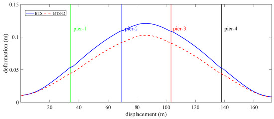 Figure 11 and Table 7 shows transverse deformation of the rail. SSPSDs reduced peak midspan deformation from 120.86 mm to 102.86 mm (14.9% reduction) while promoting more uniform deformation distribution. This indicates enhanced global bridge stiffness from the dampers, which optimizes longitudinal constraint forces and mitigates local stress concentration risks.