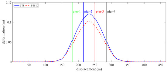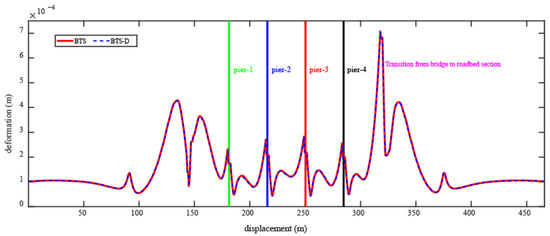 As critical connectors between track and bridge, fastener deformation variations reflect adjustments in track-girder interaction. Figure 14 demonstrates significantly reduced peak fastener deformation in bridge sections of the HSRTBDS, while reductions at subgrade transitions remain marginal. Comparative BTS and BTS-D curves reveal substantial deformation differences (≈26.7% peak reduction) within bridge spans (100–400 m), contrasting with minimal changes (<5%) in subgrade sections (<100 m, >400 m). This spatial distribution indicates that dampers primarily suppress fastener shear demands by mitigating global bridge vibrations but exhibit limited effectiveness in optimizing local constraints at subgrade-bridge transitions. Complementary reinforcement via end anchors or restraining blocks is thus necessary for comprehensive system performance enhancement.