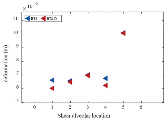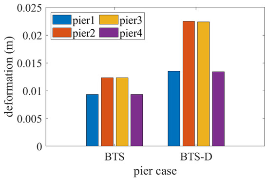 As shown in Figure 12 and Table 8, the deformation increments of the four bridge piers sequentially increased from 9.348 mm, 12.346 mm, 12.340 mm, and 9.344 mm to 13.546 mm, 22.487 mm, 22.377 mm, and 13.410 mm. The corresponding deformation increases measured 4.198 mm, 10.141 mm, 10.037 mm, and 4.066 mm, representing amplitude growth rates of 44.91%, 82.14%, 81.34%, and 43.51%, respectively, with an average increase amplitude of 62.97%. Although absolute deformations remain well below the code limit, this amplification may result from dampers enhancing the global structural stiffness, thereby redirecting seismic energy toward the piers and reducing dynamic responses in the superstructure. As depicted in Figure 13, shear key responses exhibit spatial non-uniformity: Deformations decreased at Positions 1, 3, 4, and 5 but slightly increased at Position 2. This phenomenon likely relates to localized stress redistribution induced by damper placement, necessitating further parametric optimization to balance constraint effects.