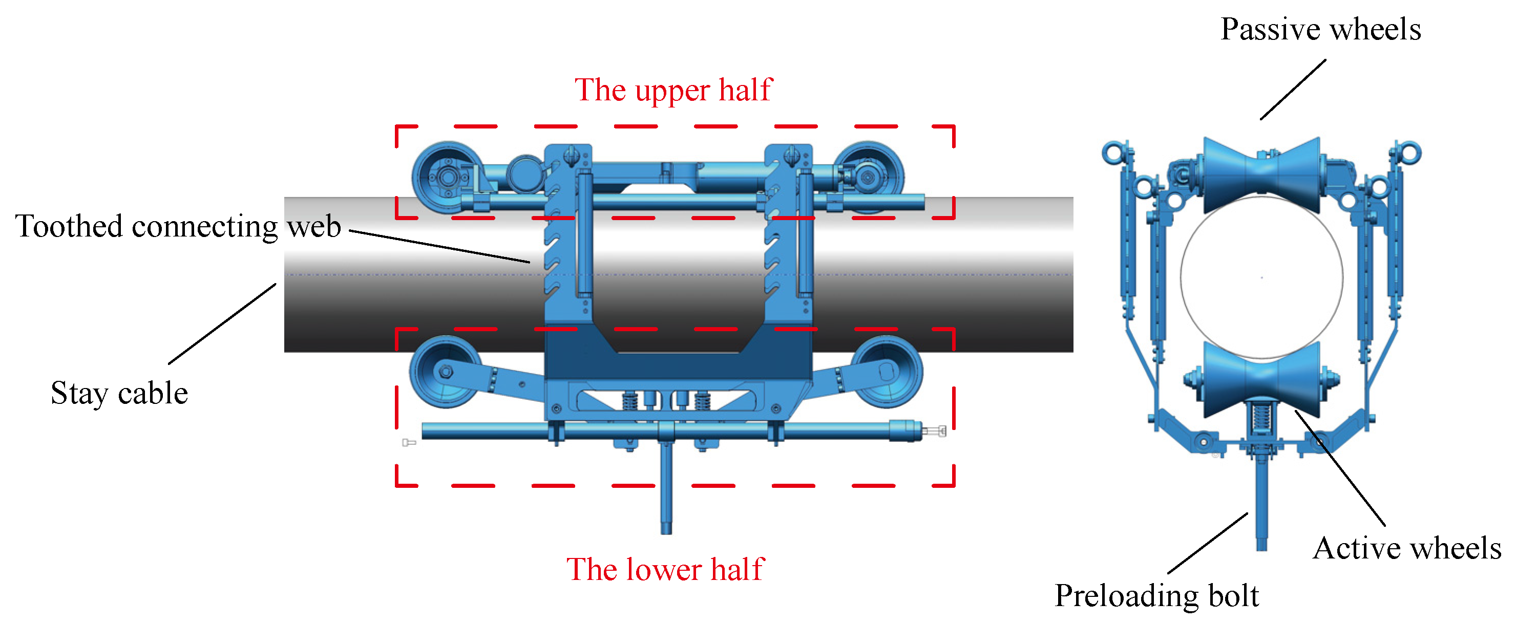 Adaptivity to various cable diameters is achieved by dividing the system into an upper half and a lower half, connected by a toothed web plate. The toothed web plate offers multiple locking positions, allowing adjustment for cable diameters ranging from 90 mm to 260 mm. Once the robot is installed on the cable, the preloading force exerted on the cable can be fine-tuned by rotating the preloading bolt, ensuring stable and reliable operation.