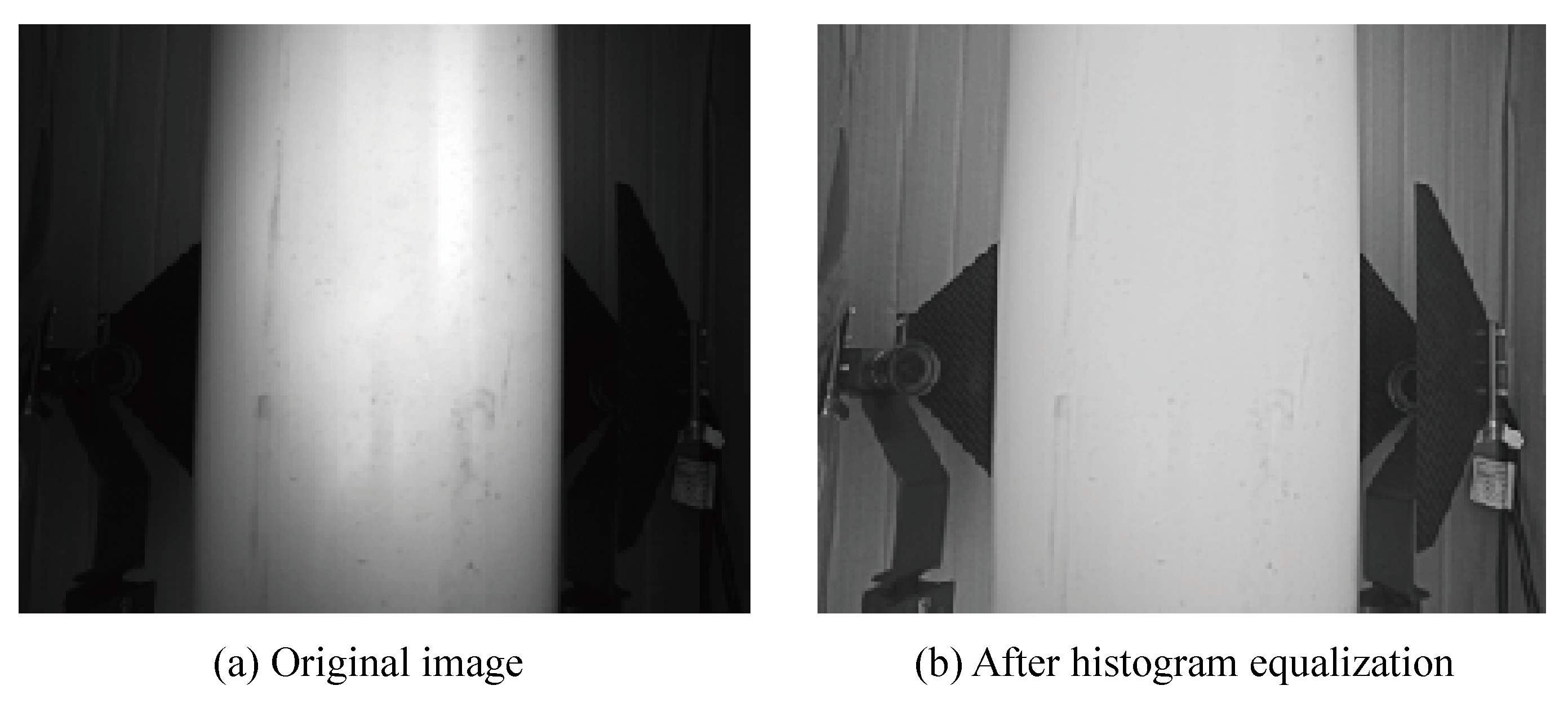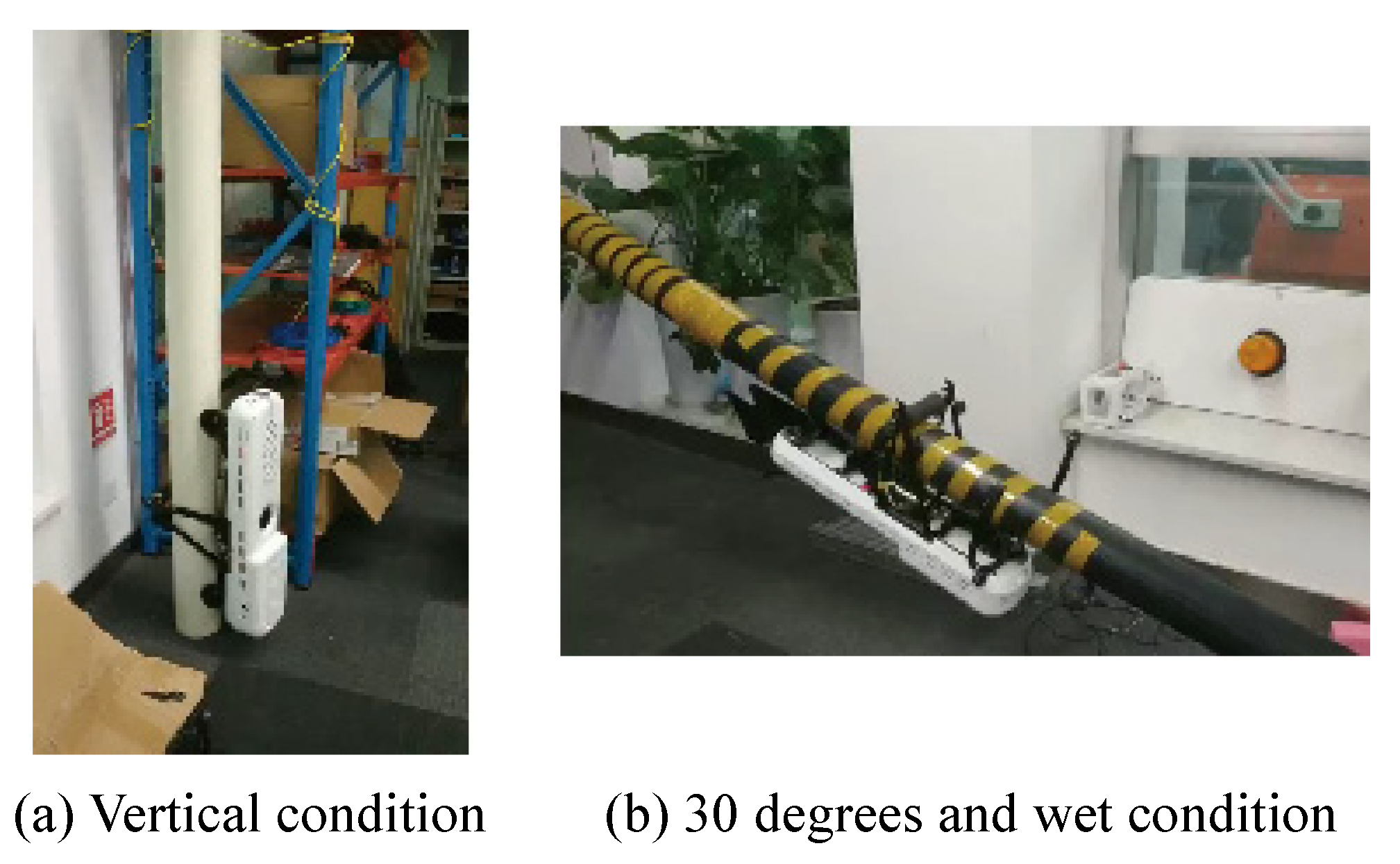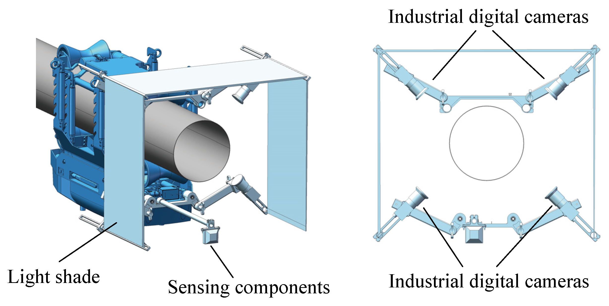 Figure 4, captures the condition of the cable surface, enabling subsequent image processing for defect detection. Four industrial digital cameras are mounted radially around the cable, with adjustable positions to accommodate various cable diameters, ensuring full 360° coverage. Adjustable light shades are employed to counter direct sunlight by modifying their angles based on sunlight intensity and direction, thus ensuring uniform light distribution and significantly improving image quality. The sensing components include a displacement sensor and an obstacle avoidance sensor. The displacement sensor records the position of captured images, providing essential data for defect localization. This is accomplished by mounting an external rotary encoder on the drive wheels, which measures wheel rotation angle and speed, generating pulse signals proportional to the wheel revolutions. The microcontroller unit (MCU) processes these pulse signals to calculate the robot’s longitudinal displacement based on the known wheel diameter and circumference. The MCU also triggers the camera to capture images at predefined intervals of 0.15 m, ensuring uniformly spaced inspection data along the cable. Both odometry and image trigger signals are transmitted to the industrial computer, where each image is automatically associated with its corresponding displacement information. By combining encoder-based odometry data with image resolution and pixel size, the position of surface defects can be accurately determined, with a resolution of defect localization along the cable length approximately 0.01 m. The obstacle avoidance sensor, an ultrasonic device, enables the robot to automatically reverse upon detecting the surface of the bridge tower and terminate operation at a predetermined height above the bridge deck.