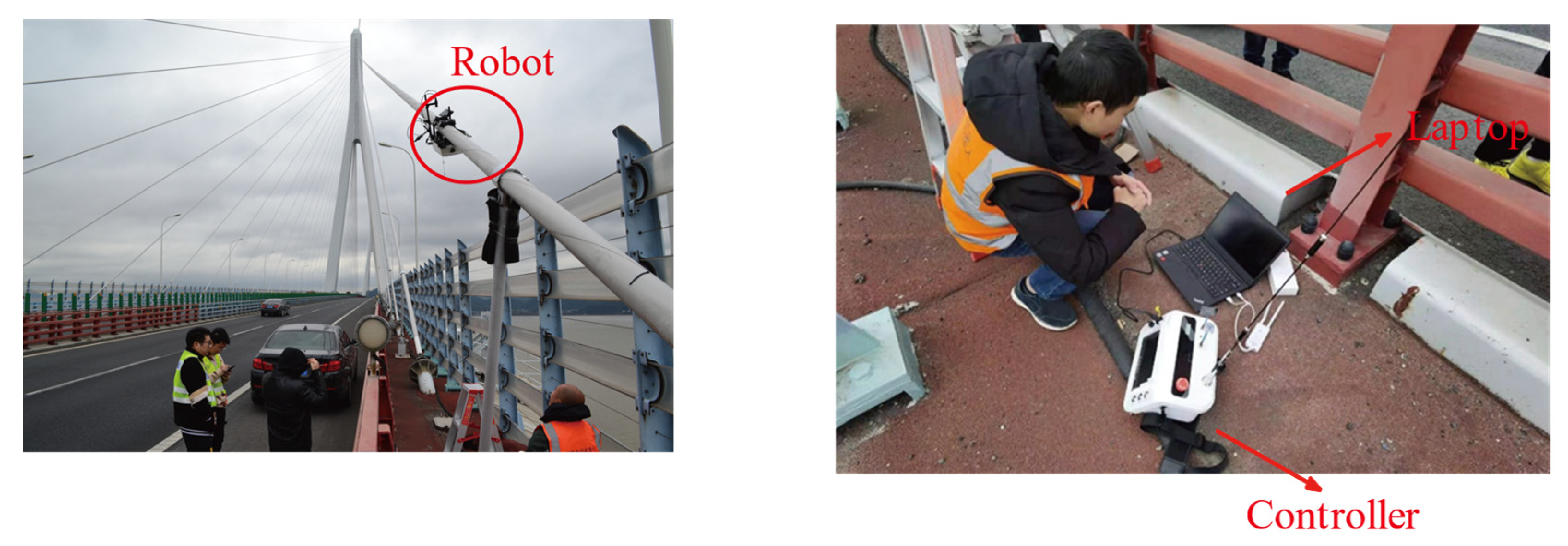 21]. These robots are designed to crawl along the stay cable, capturing high-resolution images with embedded cameras. By incorporating computer vision technology, cable surface defects can be automatically identified, significantly enhancing the efficiency of cable surface inspection [