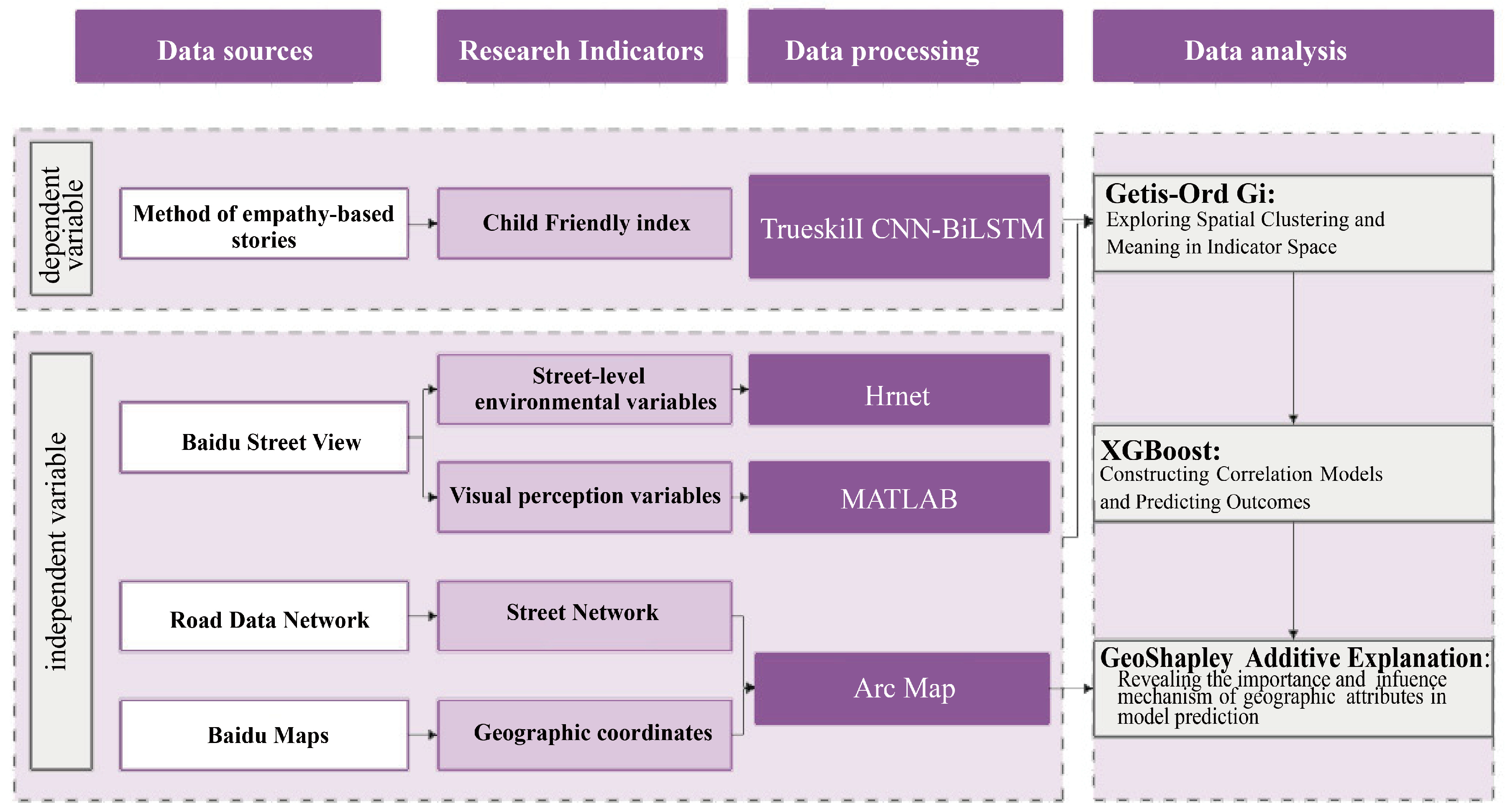 - Data analysis: SHAP analysis and interaction value analysis further explored how different street environment factors influence children’s perceptions of child-friendliness. XGBoost is used to capture complex nonlinear relationships, analyzing how various environmental features impact child-friendliness, while GeoSHapley enhances the model’s spatial interpretability by calculating the marginal effects of variables on children’s perceptions of child-friendliness, clearly identifying the impact of different spatial locations on child-friendliness.