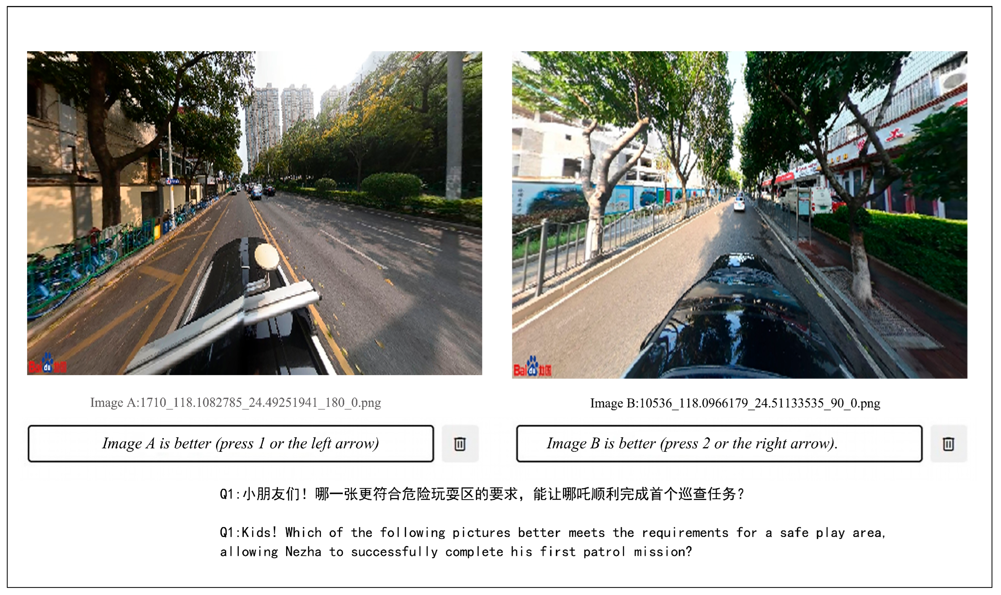 | Safety | Hey kids! Which of these options better meets the requirements for a safe play area and will help Nezha to successfully complete his first patrol mission? | This area is flat and free of hazards, ensuring that children can play safely and meeting Nezha’s safety inspection standards. | There are construction barriers in place here, and the ground is uneven. Take care when playing to avoid tripping up or bumping into things. |