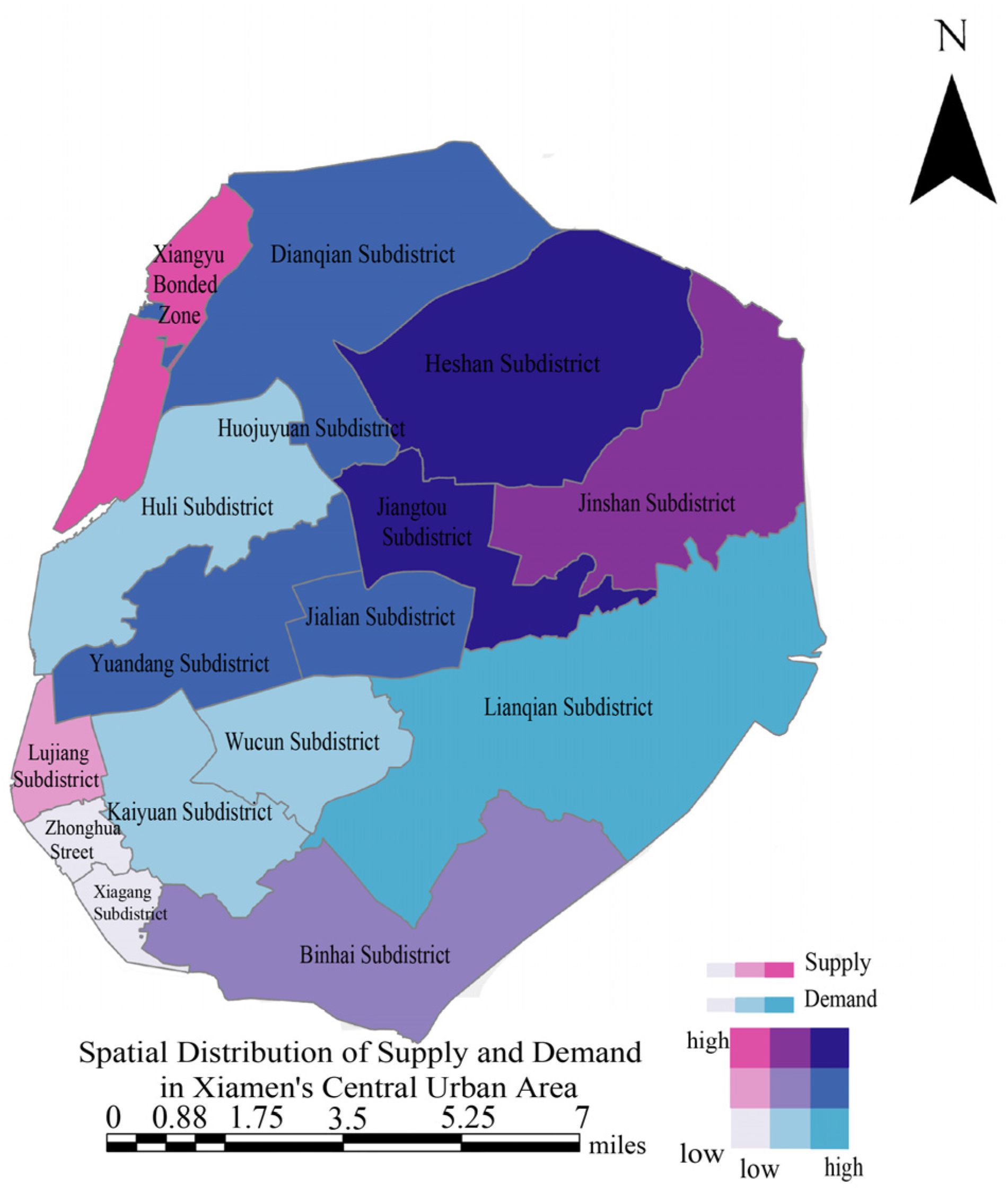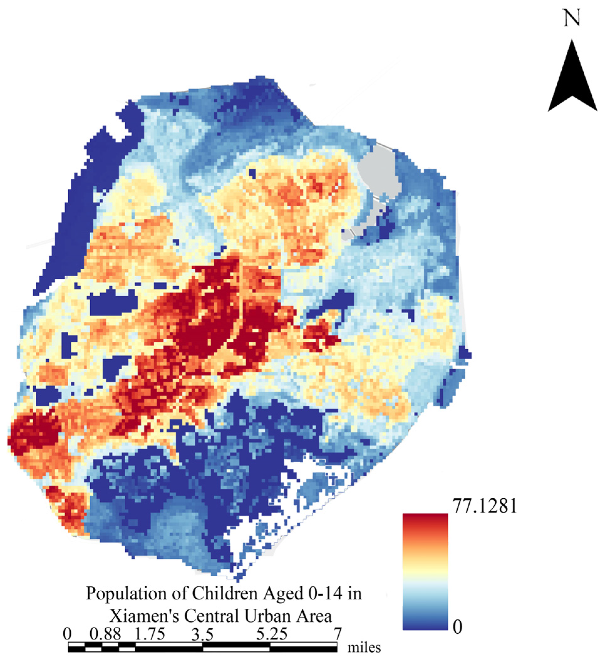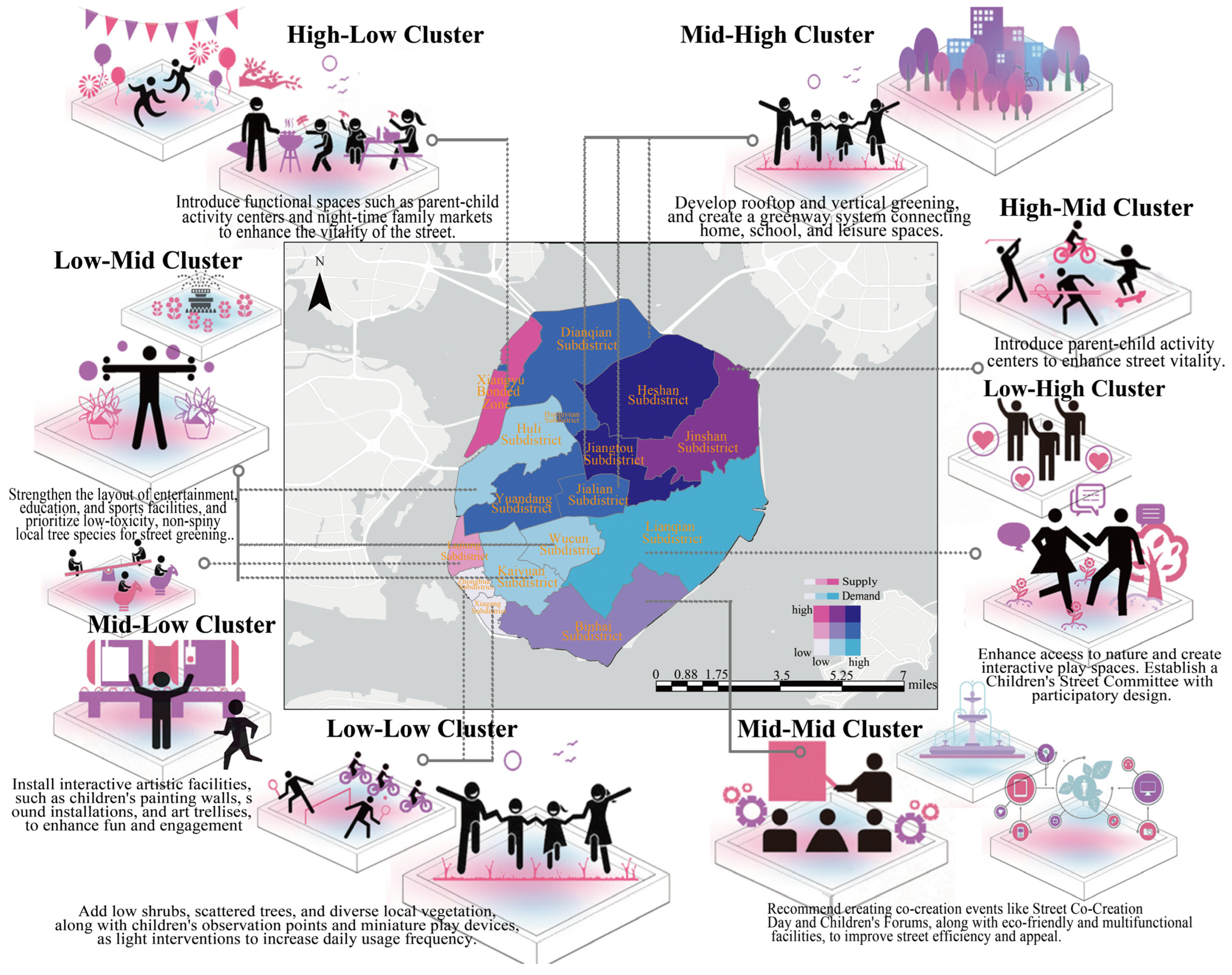 - The research results show that children’s perceptions of friendliness show significant spatial variation, particularly in high-density areas, where supply and demand mismatch for facilities. GeoSpatial analysis reveals a north–south difference in perceptions, with higher population density in the southern part of Siming District, while the northern part of Huli District has lower development intensity. Despite high spatial contribution in the northeast and central regions, these areas have lower child population density, while higher density areas show lower supply–demand matching.