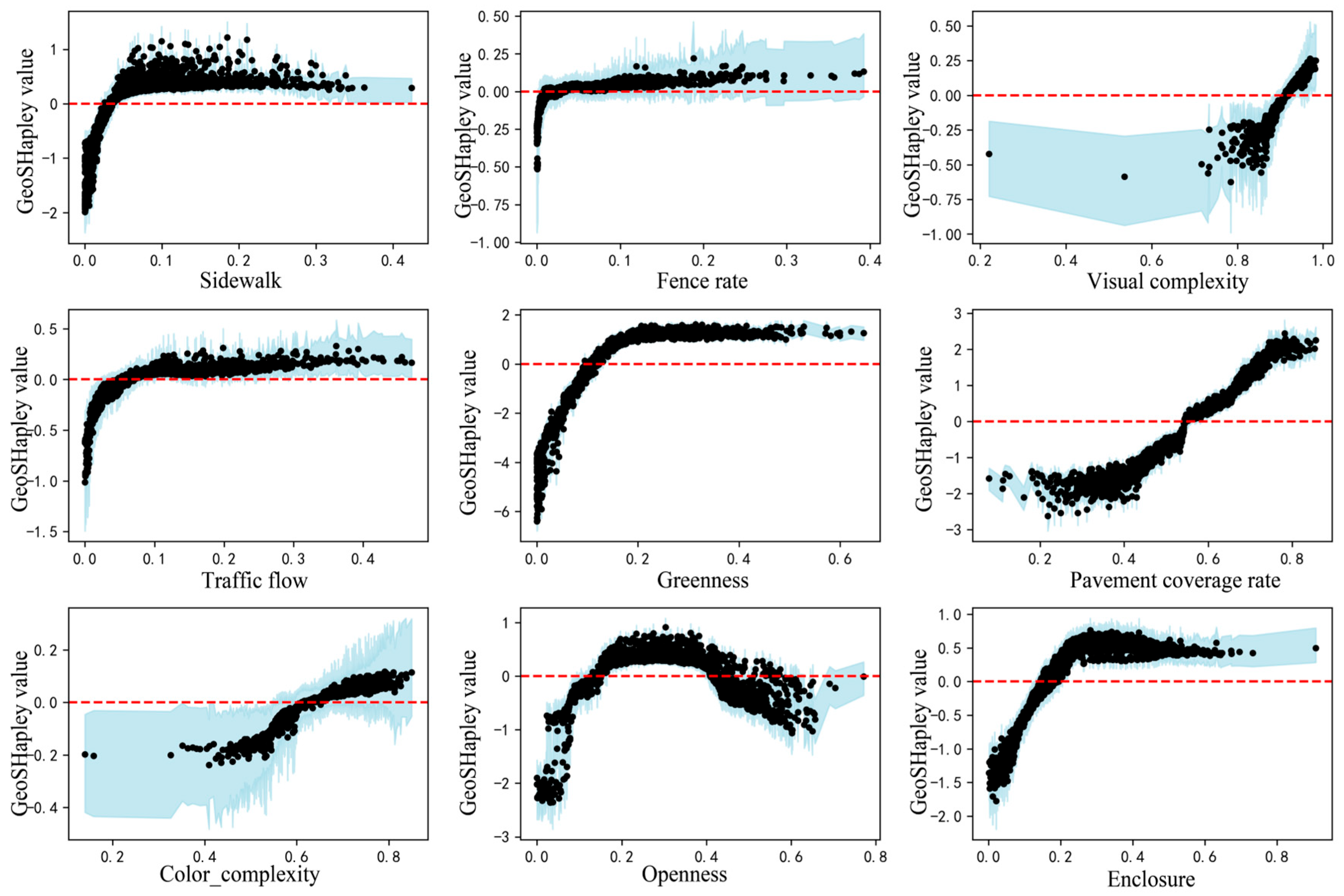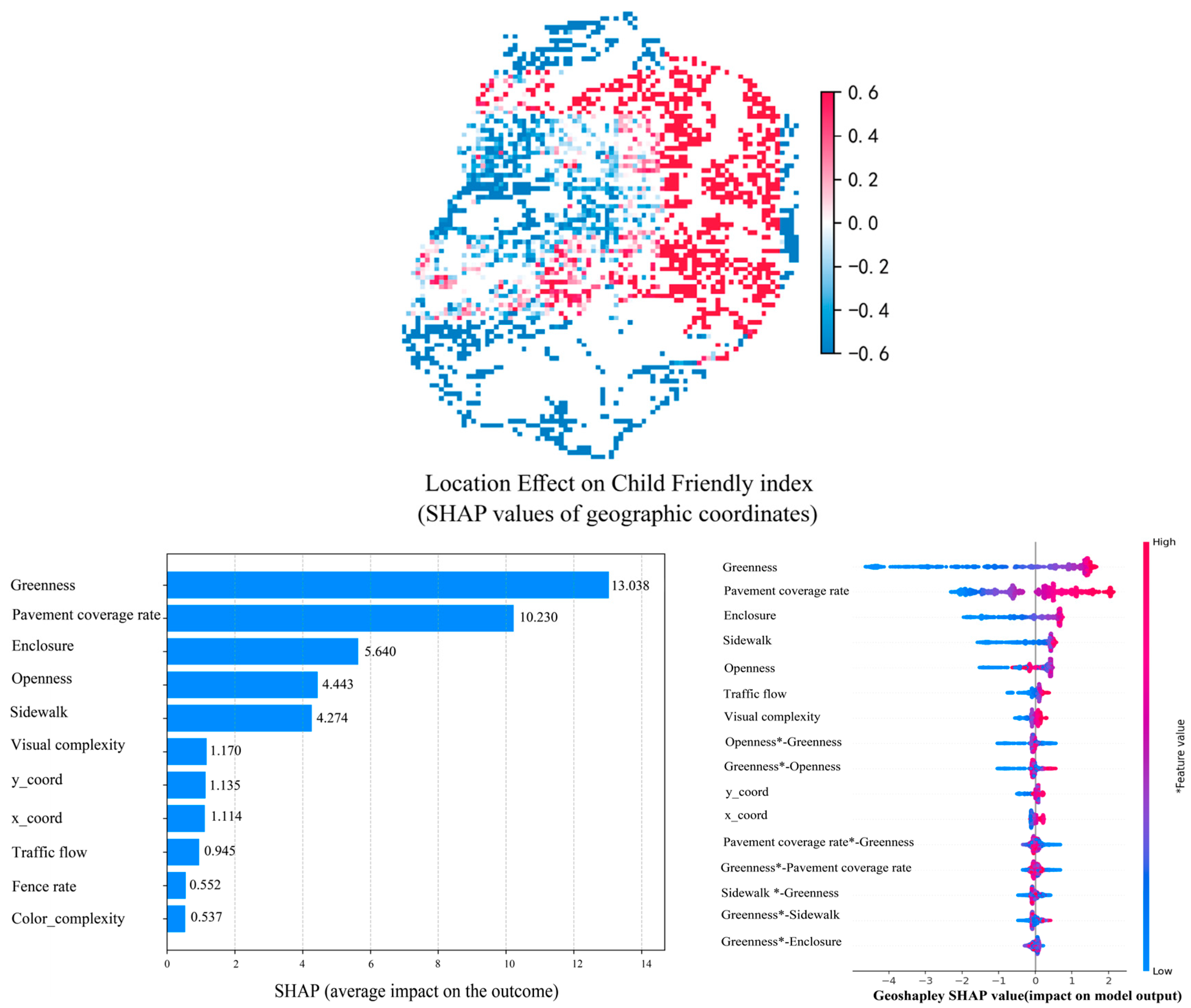 - Further analysis shows that variables such as greening rate, pavement coverage rate, and openness contribute nonlinearly in the GeoSHapley model. Their interactions significantly affect children’s sense of safety and willingness to engage with the street space. This finding strengthens the theories of visual permeability and accessibility-perceived safety in environmental psychology and provides decision-making references for participatory micro-updates at the street level.