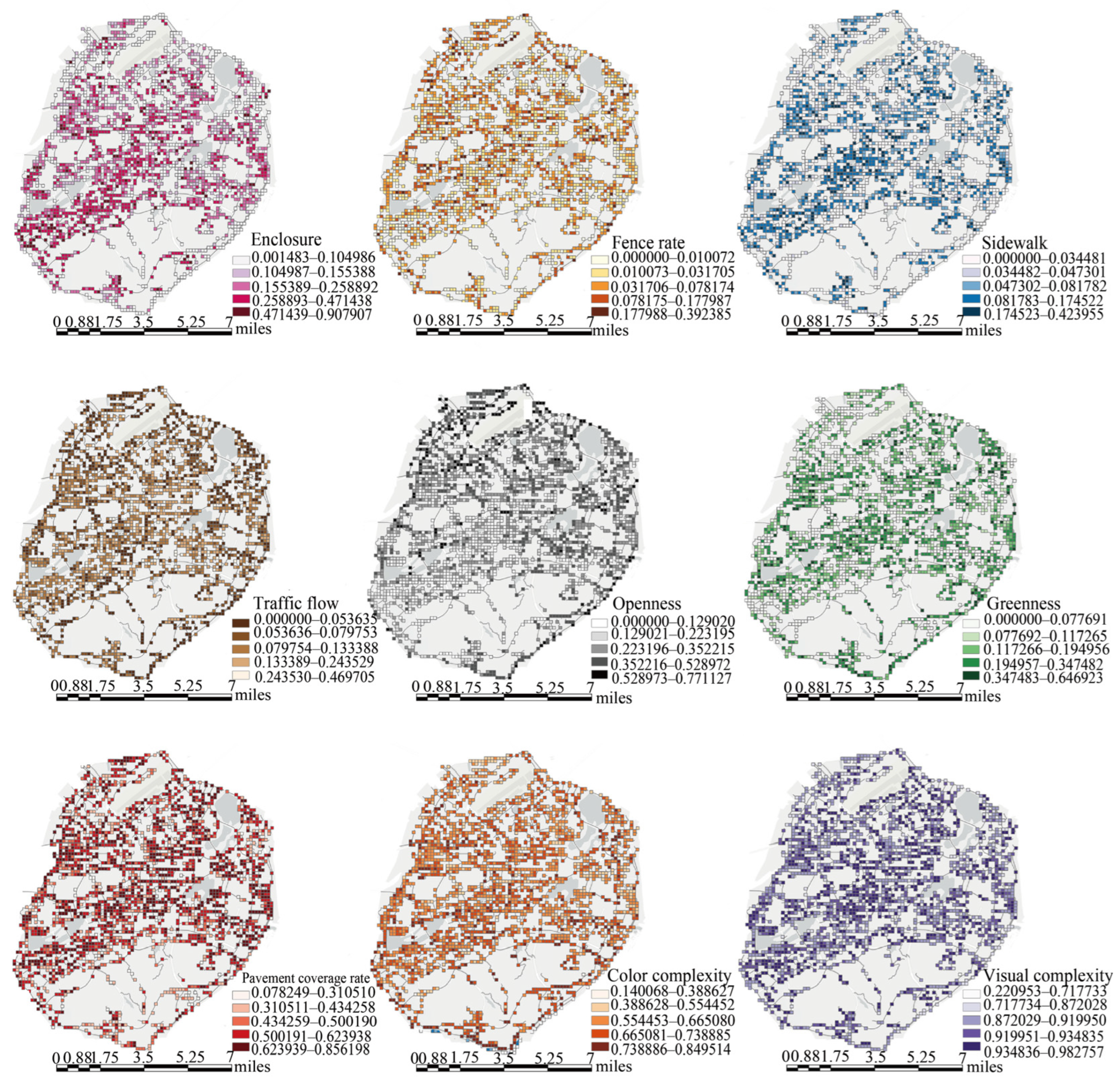 - Wang, R.; Lu, Y.; Zhang, J.; Liu, P.; Yao, Y.; Liu, Y. The relationship between visual enclosure for neighbourhood street walkability and elders’ mental health in China: Using street view images. J. Transp. Health 2019, 13, 90–102. [Google Scholar] [CrossRef]