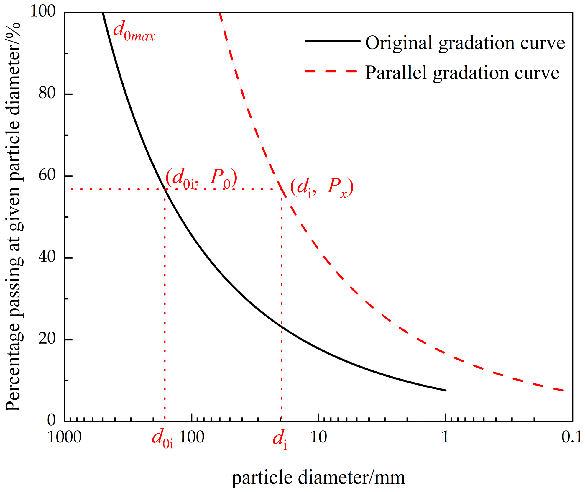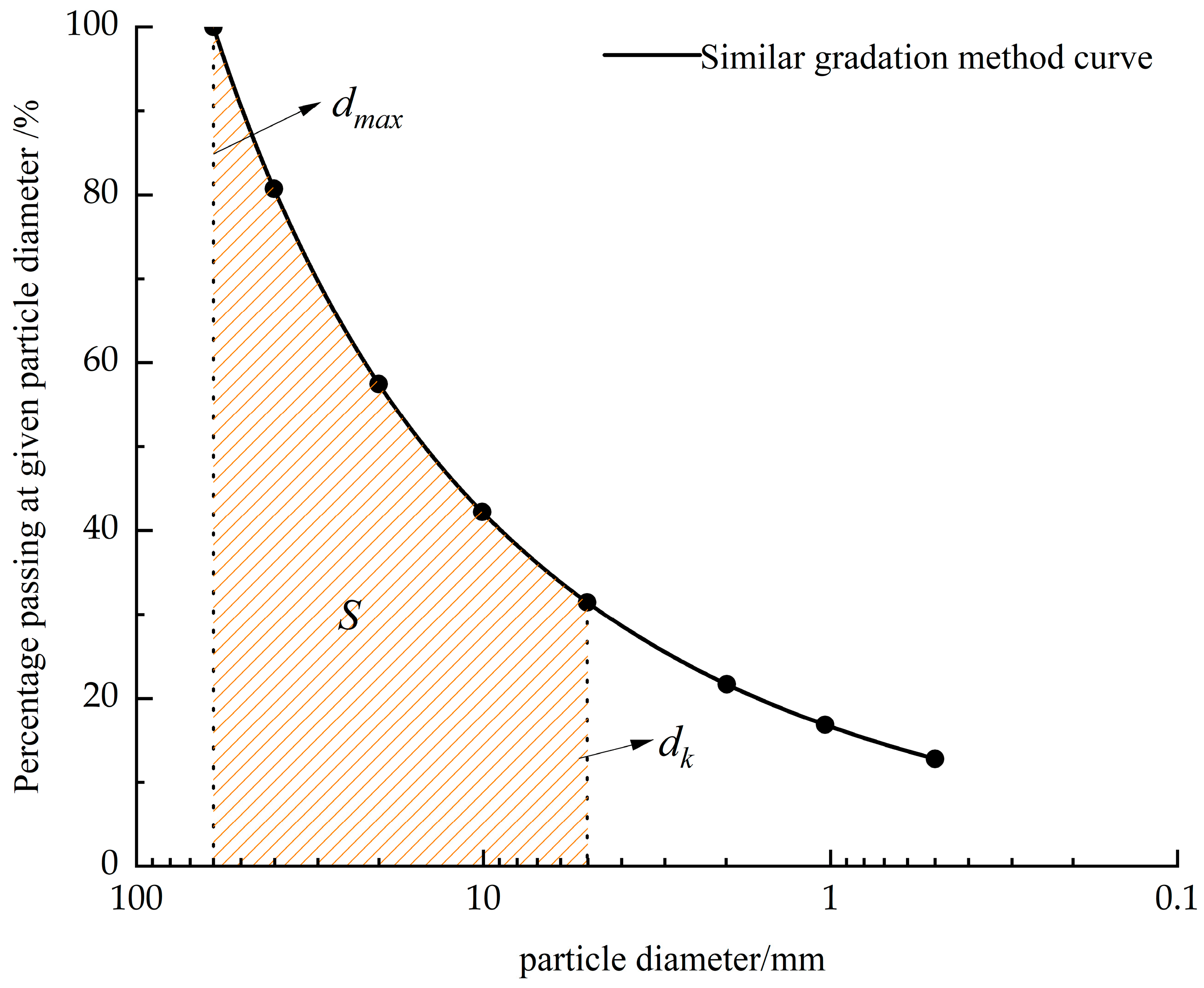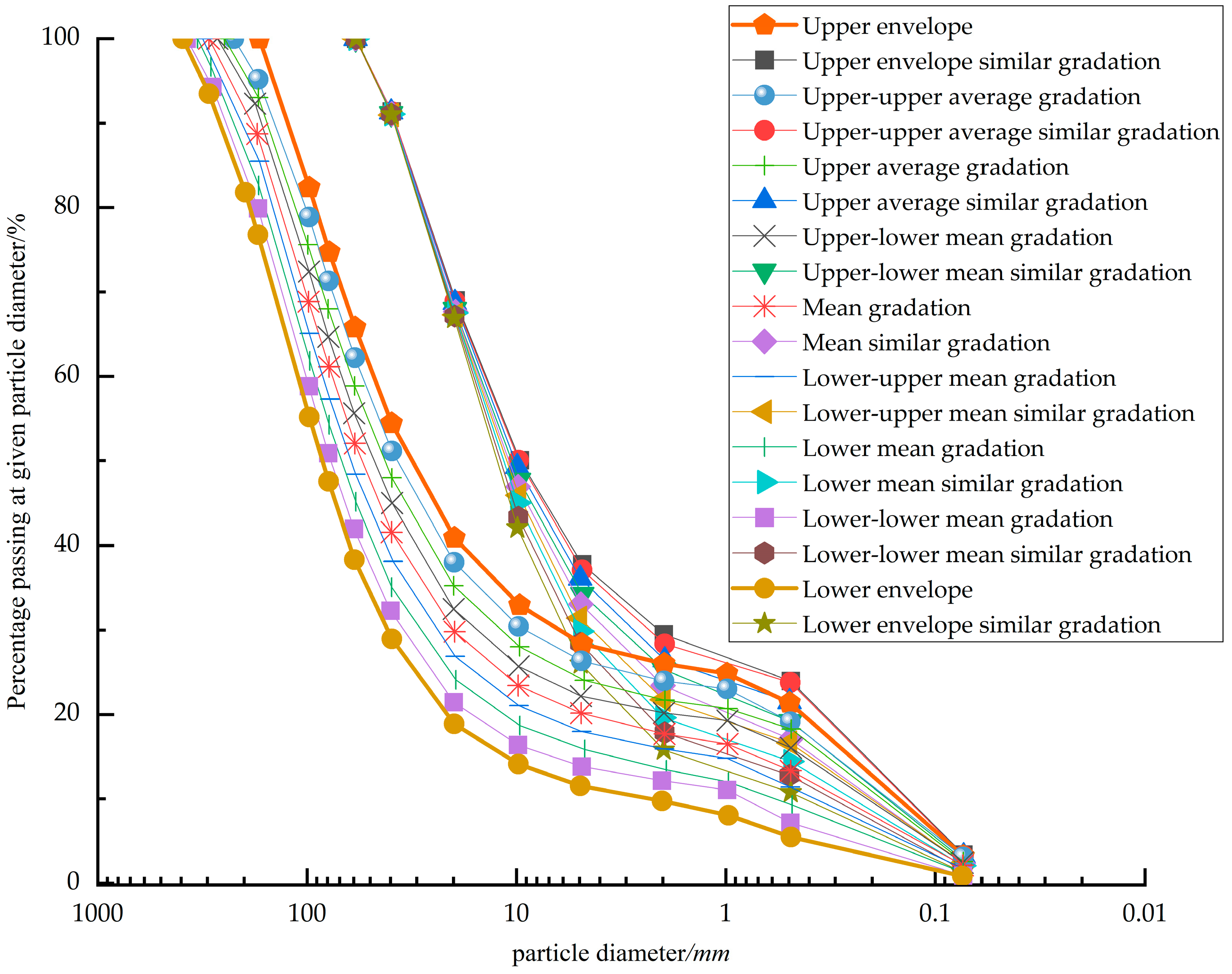 - Guo, W.L.; Zhu, J.G.; Wen, Y.F. Unified explanation of four gradation scaling methods for coarse-grained materials. Chin. J. Geotech. Eng. 2016, 38, 1473–1480. [Google Scholar]
