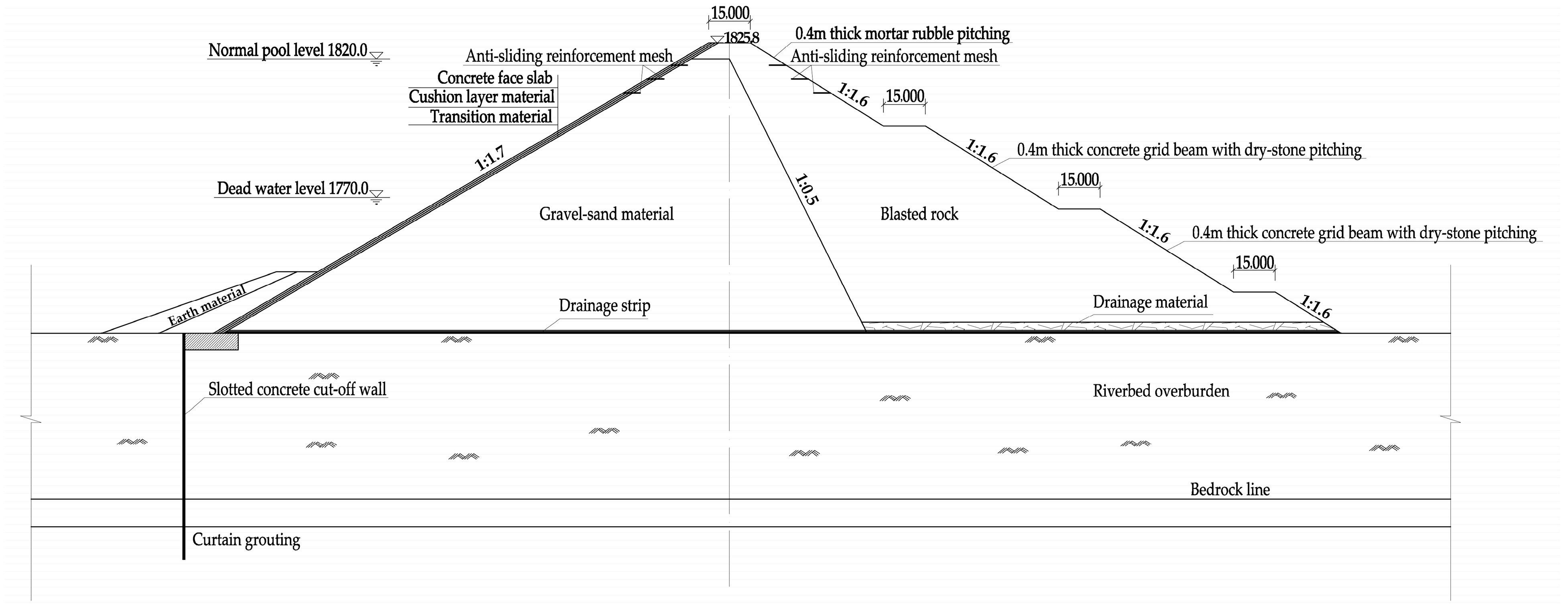 - Liu, Y.; Li, J.; Yang, Y.S.; Peng, Z.X. Filling standards and deformation control of high concrete face rockfill dams in Xinjiang. J. Hydraul. Eng. 2021, 52, 182–193. [Google Scholar] [CrossRef]