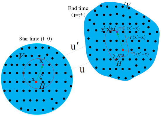 The basic idea of PD is to disperse an object into many particles with fixed numbers and determined coordinates. Each particle interacts with other particles within the interaction radius , usually . Each particle interacts with the near-field dynamic force , and the force state vector is used to represent the near-field dynamic force of all interactions.