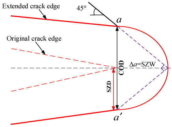 After the action of external load, the crack tip tends to passivate, open and extend, and this part of the material is subjected to strong tensile load to form an elongation zone. Therefore, the size of crack tip opening displacement is used to represent whether the crack continues to expand forward. As shown in Figure 3, COD represents the displacement at the crack tip opening, SZD signifies the height of the stretched zone, and SZW denotes its width, equivalent to the distance of crack extension. During this phase, the crack advances from the original crack boundary to the newly formed edge, where SZD is equal to SZW.