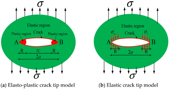 During crack tip opening, blunting, and extension, a plastic zone forms at the tip, as shown in Figure 4a, where represents stress or external load. Under loading, the red areas at tips A and B are plastic zones; the rest remains elastic. The plastic zone size (2R) is much smaller than the crack length (2C), so 2C >> 2R. In this region, the material reaches its limit and can no longer carry load. Thus, the plastic zone is treated as part of the crack, extending the effective length from 2C to 2, simplifying the elastoplastic problem into an elastic one, as shown in Figure 4b.