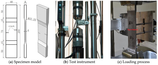 Q345 steel characterized by an elastic modulus of 203 GPa, a Poisson’s ratio of 0.3, an elongation of 27.96%, yield strength of 410 MPa and ultimate strength of 572 MPa was used to make three kinds of specimens with a length of 70 mm, width of 40 mm, and bilateral cracks: 5 mm length, spaced at 0 mm, 10 mm, and 20 mm. Models are shown in Figure 5a.
