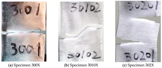 Figure 6 shows the fracture outcomes of the three specimens under tensile loading. Figure 6a presents the 300X specimen featuring bilateral cracks with zero longitudinal spacing, where the crack ultimately develops into a horizontal fracture. Figure 6b displays the 3010X specimen with a 10 mm longitudinal separation between the two cracks. The cracks on both sides began to expand in a straight line and then spread in opposite directions along a tilt angle of about 30–45 and finally run through the whole specimen. Figure 6c shows the 3020X specimen with 20 mm bilateral crack spacing. The wide separation prevents crack interaction, allowing independent propagation and formation of two distinct horizontal cracks.