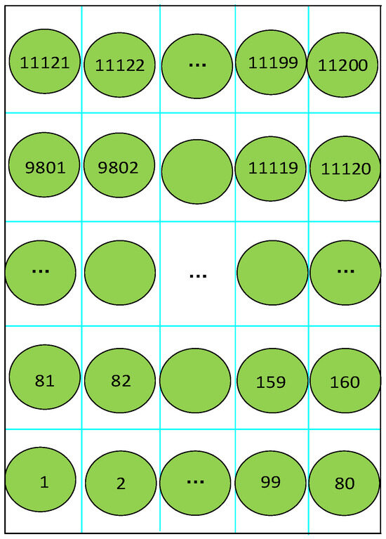 Due to the uniform load, the PD physical model simplifies the Q345 steel plate to the unidirectional tensile problem of the two-dimensional specimen size 70 mm × 40 mm × 0.5 mm along the length direction. The PD model cell has a side length of ; there are 11,200 particles in the plate, and the division and distribution pattern of the PD particles in the specimen are shown in Figure 7. The load is applied uniformly to the nodes within a boundary region of width of . The relationship between the crack propagation path and crack length of bilateral crack specimens is simulated by PD theory.