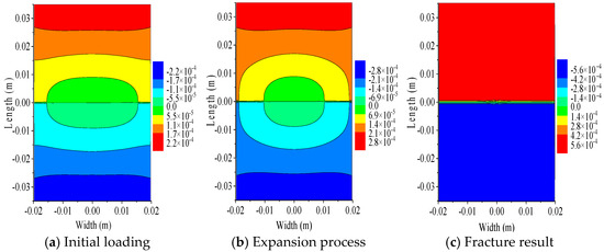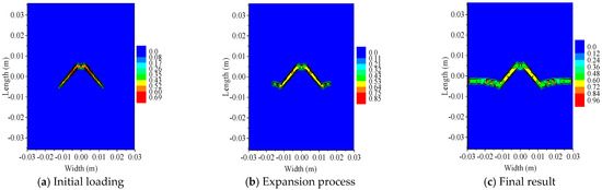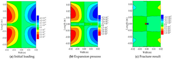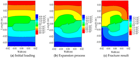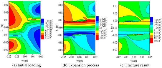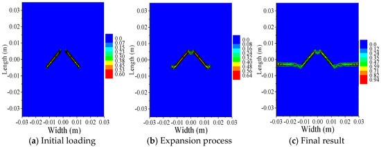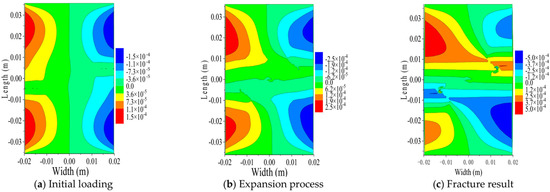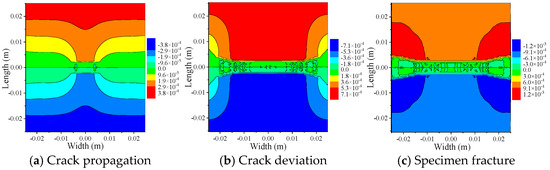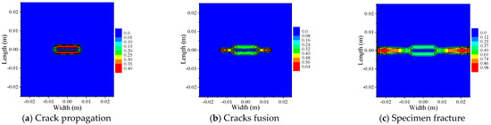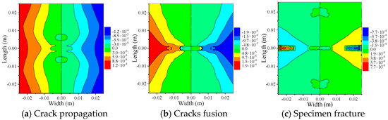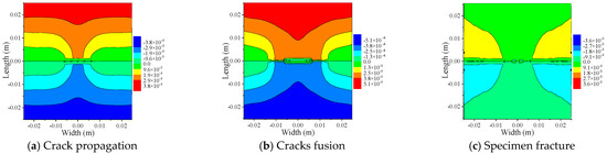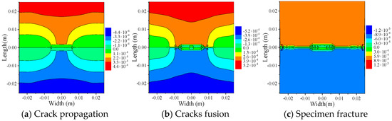 Figure 9 presents the crack initiation and propagation process of the 300X specimen and the displacement variation of the particles along the X direction within the specimen. As shown in Figure 9a, during the crack initiation and propagation, the displacement of the particles at the upper and lower ends of the vertical crack is the largest, forming a semi-circular shape that is symmetrical about the X-axis and antisymmetric along the Y-axis. As illustrated in Figure 9b, as the crack propagates, the area with the maximum particle displacement gradually expands towards the crack tip at the same rate. When the crack is about to penetrate the entire specimen, the semi-circular displacement of the particles about the X-axis disappears, becoming a rectangular symmetry about both the X-axis and Y-axis, and the position of the maximum particle displacement shifts to the area where the two crack tips are about to merge, as shown in Figure 9c.