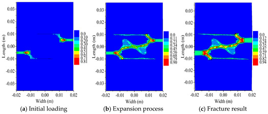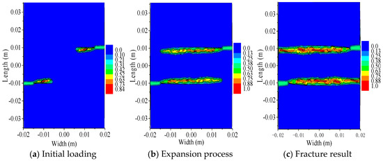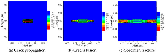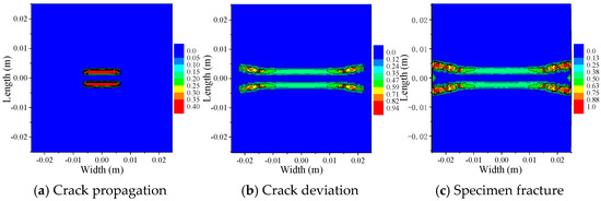 Figure 11 illustrates the damage evolution and crack propagation process in the 3010X specimen, which contains bilateral cracks of 5 mm in length and a longitudinal crack spacing of 10 mm, under applied loading. As shown in Figure 11a, with the continuous load application, the two crack tips spread along the horizontal direction for a short time, and then the crack tips spread along the direction of 30°~45° with the horizontal direction, and the damage value is about 0.8. Subsequently, the crack tip began to bifurcate and formed two damage cracks with an angle of about 70°. At the same time, the two cracks expanding opposite each other gradually developed into the main crack; the other two cracks only formed local damage in the crack bifurcation region, as shown in Figure 11b. The two main cracks finally merged into an oblique crack with an angle of 30°~45° from the horizontal direction, and the damage value was about 1.0, as shown in Figure 11c.