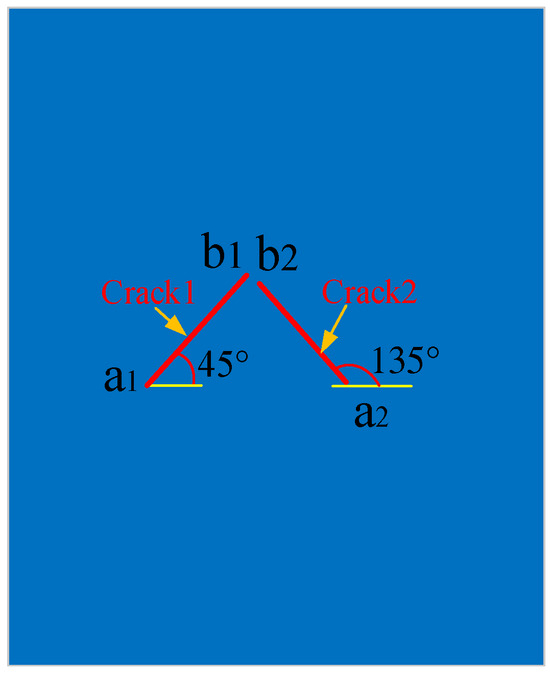 Figure 27 shows the whole process of cross oblique crack propagation simulated by PD elongation fracture criterion. At the initial stage of loading, both sides of the 45° and 135° oblique cracks propagated forward. When the load was applied, the b ends of the two inclined cracks coalesced, while the a ends extended further in the horizontal direction, as illustrated in Figure 27a,b. Finally, the b end of the two oblique cracks fused into a crack, and the a end of the two cracks formed a horizontal crack through the width direction of the specimen, as shown in Figure 27c.
