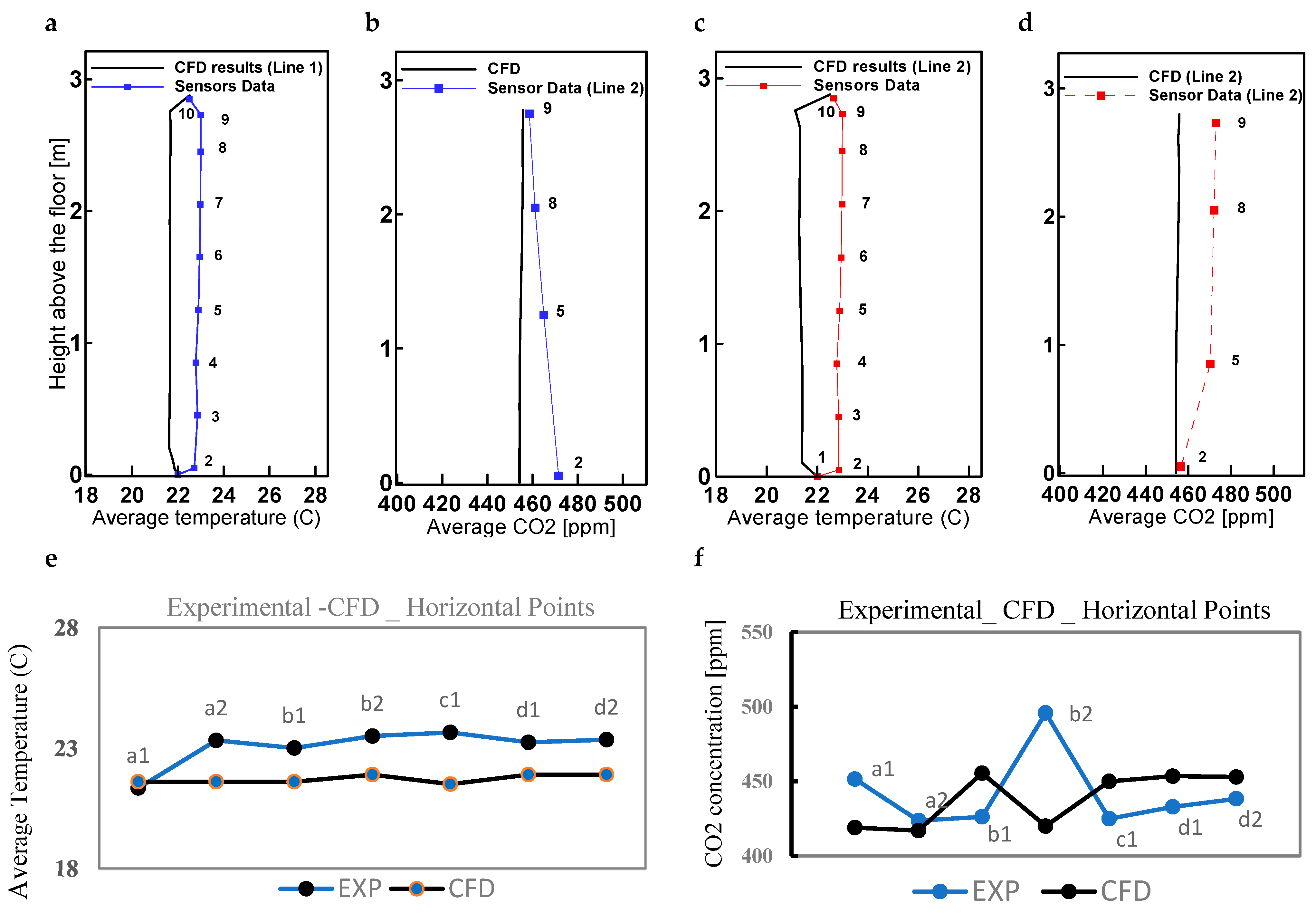 To measure the variables, vertical lines 1 and 2 (Figure 1a) and horizontal lines a, b, c, and d (Figure 1b) were drawn as reference axes intersecting the sensor locations. The steady-state simulated CO2 concentration was evaluated by comparing it to the average CO2 measurements recorded by sensors positioned at corresponding locations, as shown in Figure 1, and described in the experimental setup. Figure 3 illustrates the average measured temperature and CO2 concentration at the sensor locations (Figure 1) in the unoccupied experimental test room over a three-month period, along with the results from the steady-state CFD simulation. Figure 3a–f show the discrepancies between simulated data and measured data at the sensor point locations. The mean absolute error between the temperature data from sensors and the simulation was 1 °C and 1.2 °C for sensors at lines 1 and 2, respectively. Outdoor CO2 fluctuations, not thoroughly mixed conditions, affected the experimental environment, and the sensor data show deviations from the simulated data. The simulated data were within acceptable accuracy with the experiment results for further study and modeling other room conditions. The results shown in this section are limited to model validation, not the actual results from the broader range of simulations.