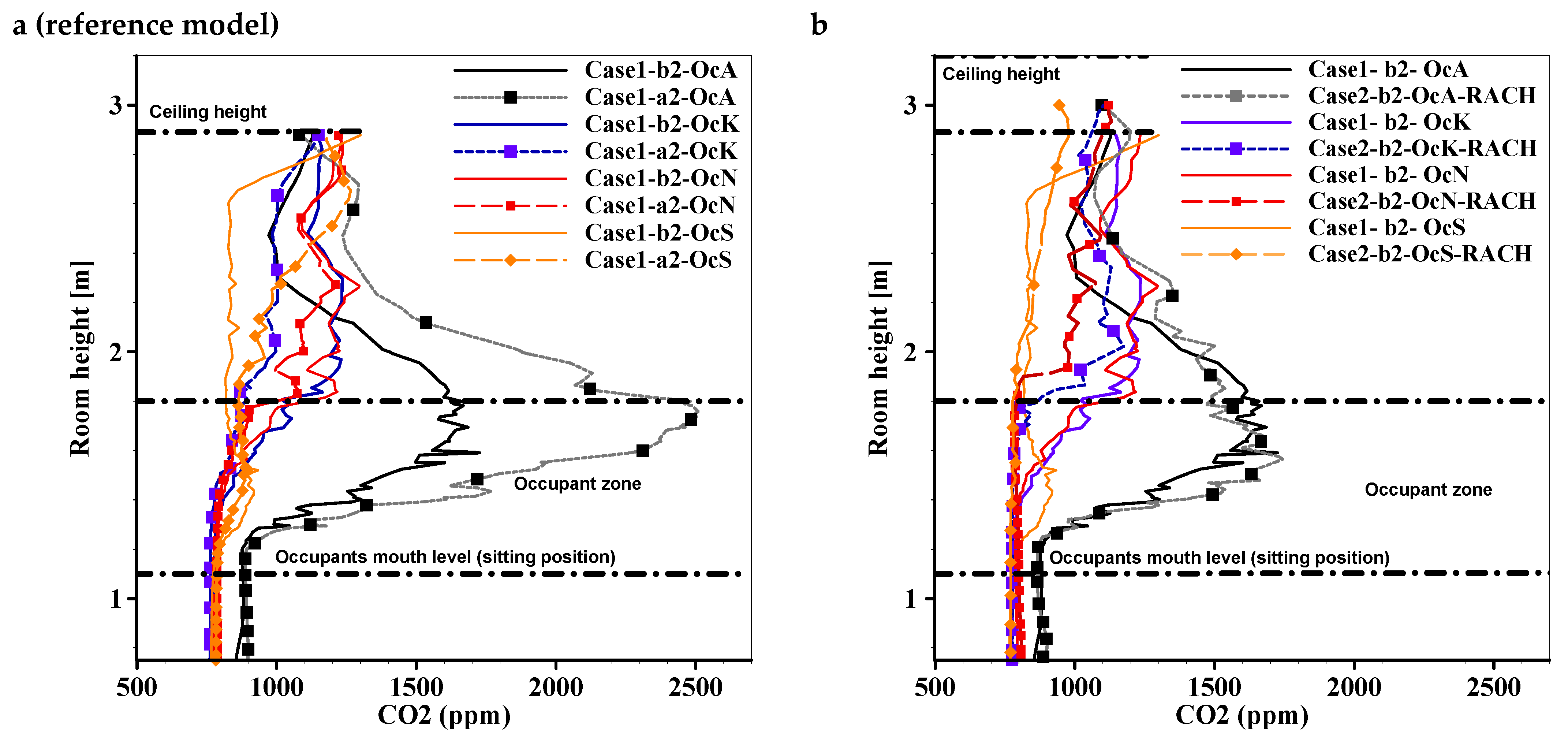 As can be seen from Table 4, two different ACH levels were examined. The baseline ACH was 3.06, as described in Table 1. When the ceiling height was changed, i.e., the room volume was changed, the supply airflow rate was also adjusted to keep the ACH at the base case level for model Case 2-a3. Then, the air supply rates were kept constant as the reference model, and the ceiling height was changed (i.e., change in room volume) to reduce the ACH, which are shown as models described with RACH at the end of their names. Finally, for a smaller ceiling height, the supply flow rate was also reduced to achieve the same level of ACH for Case 3-a1 and Case 3-b1.