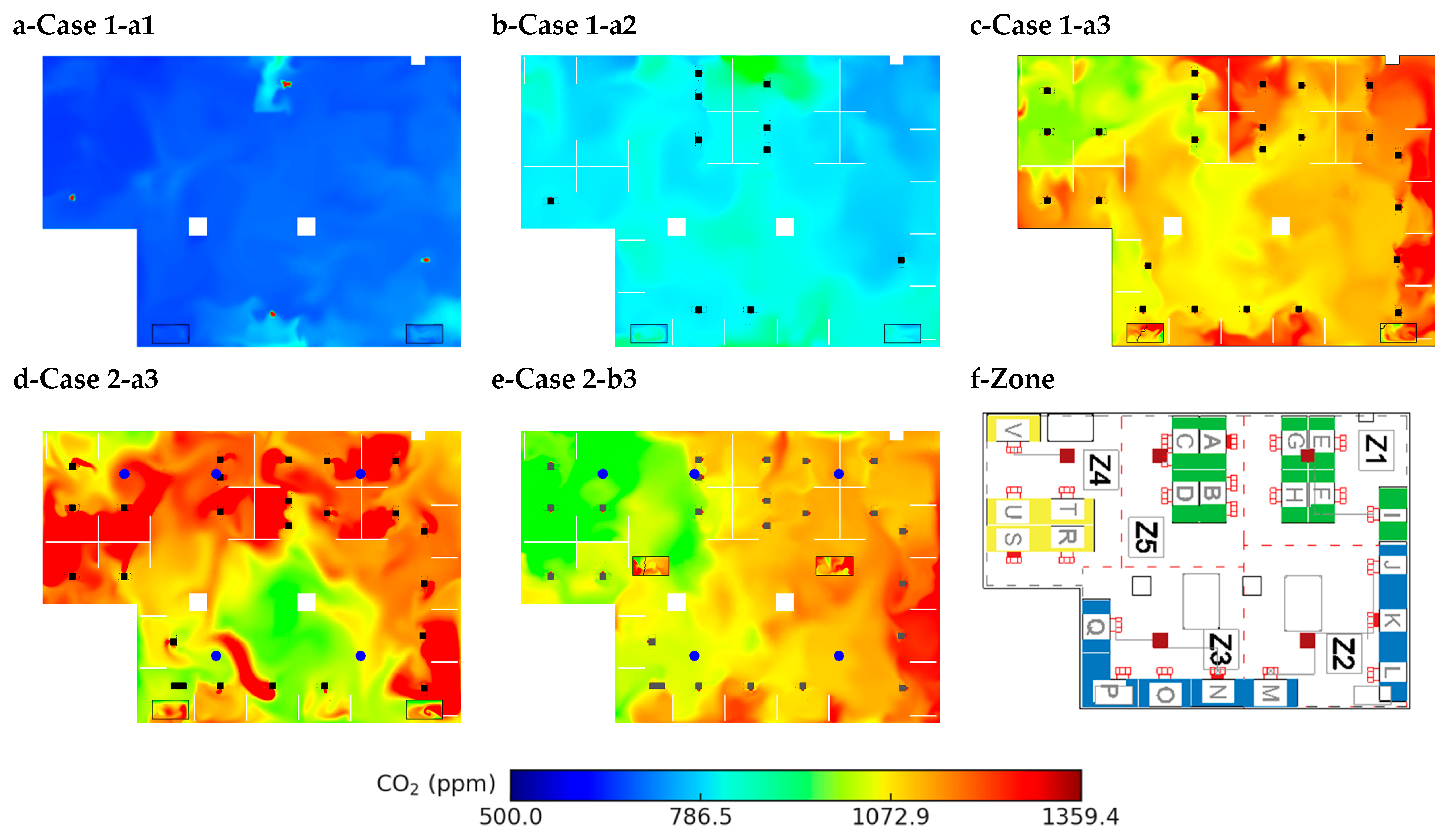 ε     j r is the ventilation effectiveness, C   f s represents the concentration in the exhaust, C   j s denotes the average concentration at the point j, and C t is the concentration at the supply. The CO2 levels in the room vary across the different areas. To analyze the effectiveness of system settings and measure each zone’s VE, the room was divided into five zones based on the seating arrangement and the occupants’ distance from the nearest dominant supply, corresponding to the total number of occupants. A dominant inlet is defined as the inlet with the most significant impact on the occupants in each zone.