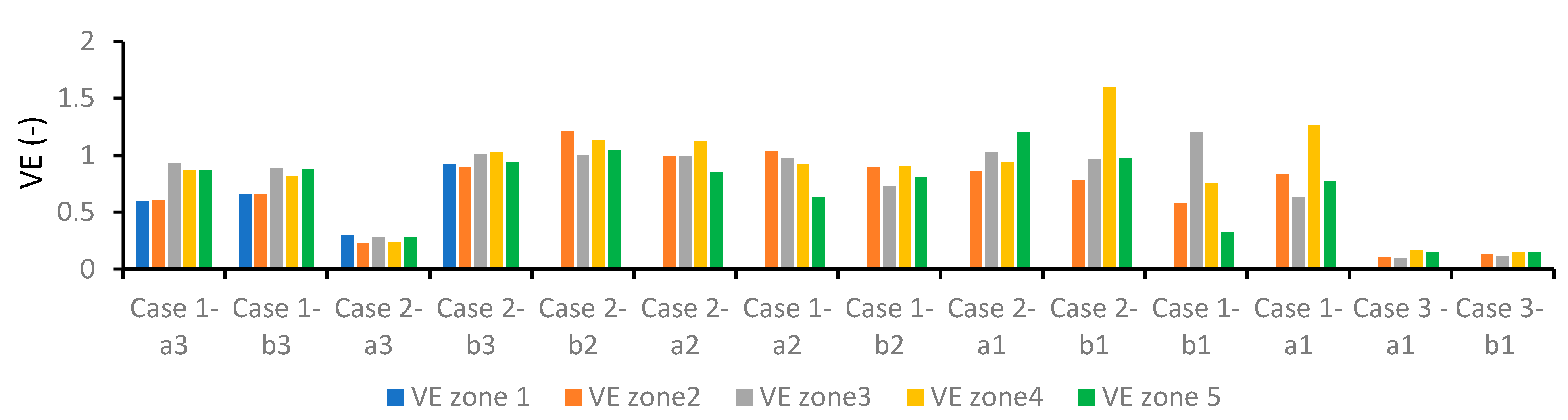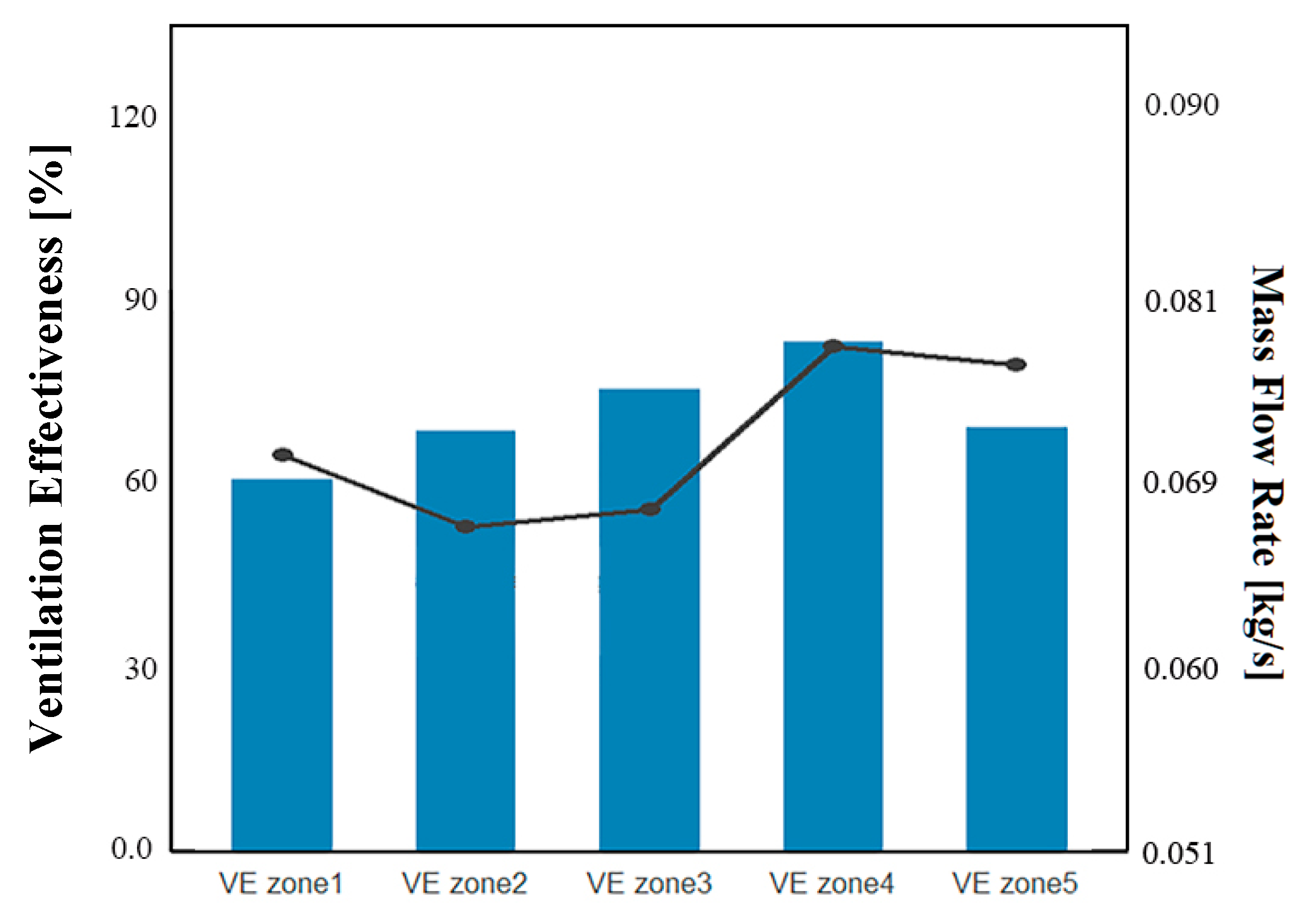 Figure 12 shows VE and mass flow across five zones. Blue bars denote the average VE, and black lines represent the mass flow rate for each zone. Zone 4 has the highest VE, with a high supply mass flow, while Zones 1 and 5 exhibit lower VE despite moderate flow, indicating inefficiencies in airflow distribution. With 8% higher supply, Zone 4 achieves 26% better VE than Zone 1.